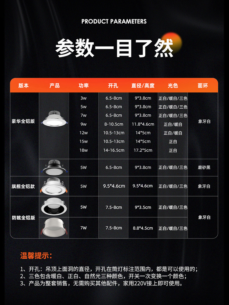 灯光颜色 | 【亮银全铝】5W三色 开孔6.5-8cm | | 灯光颜色 | 【砂黑全铝】5W暖白 开孔6.5-8cm |