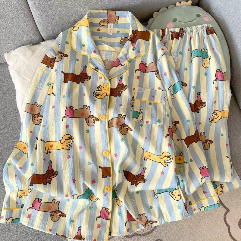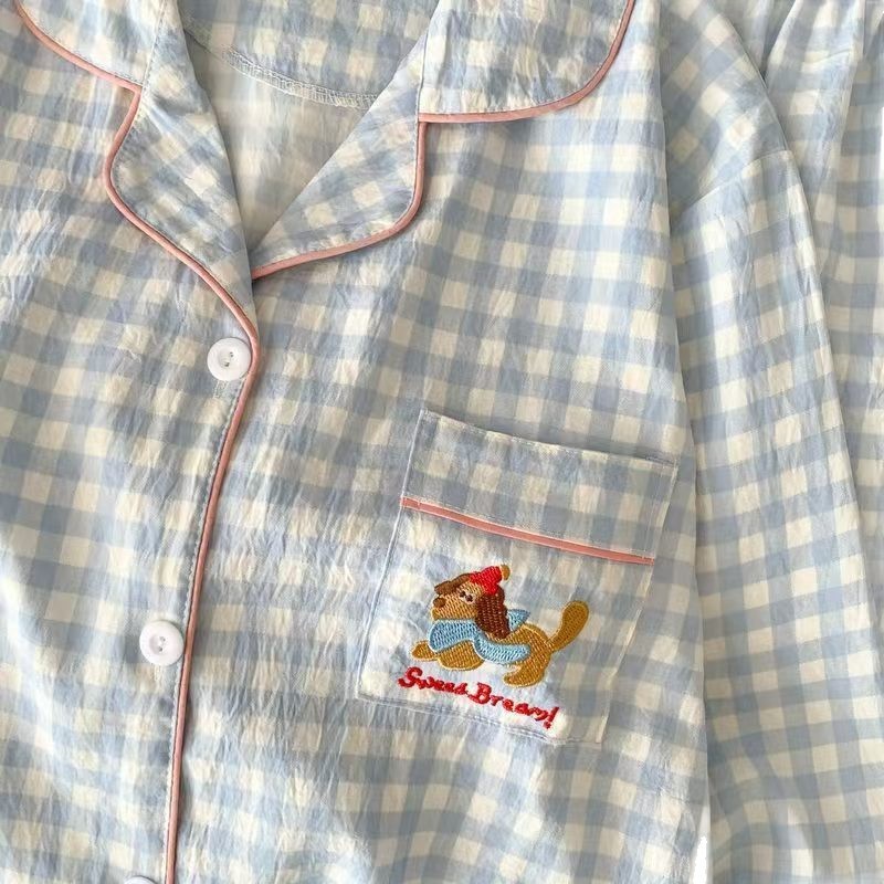 甜梦大码睡衣女日系蓝格子腊肠狗春秋长袖少女家居服两件套装