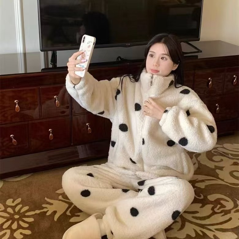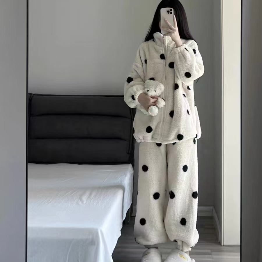 COC波点睡衣女秋冬新款法兰绒家居服珊瑚绒加厚加绒拉链保暖睡衣
