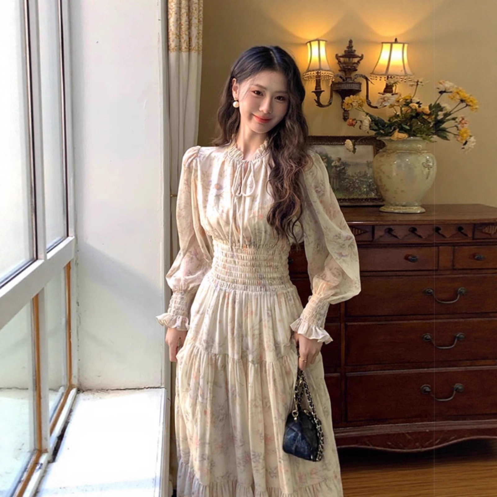 爆款法式秋冬新款碎花裙雪纺茶歇长裙高级感长袖收腰仙女裙连衣裙