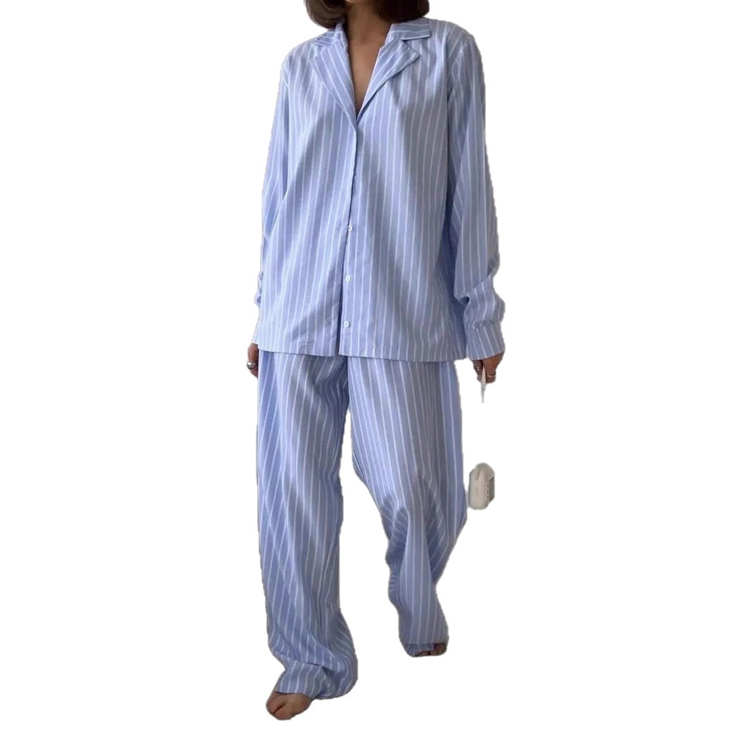 跨境2025女士条纹印花套装春秋长袖衬衫单扣直腰裤休闲宽松2件套.