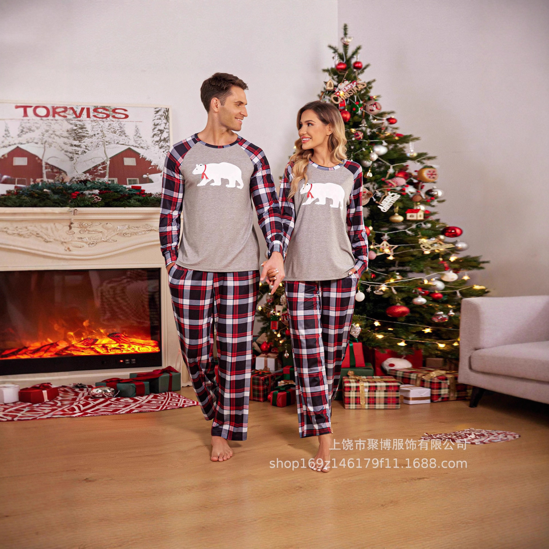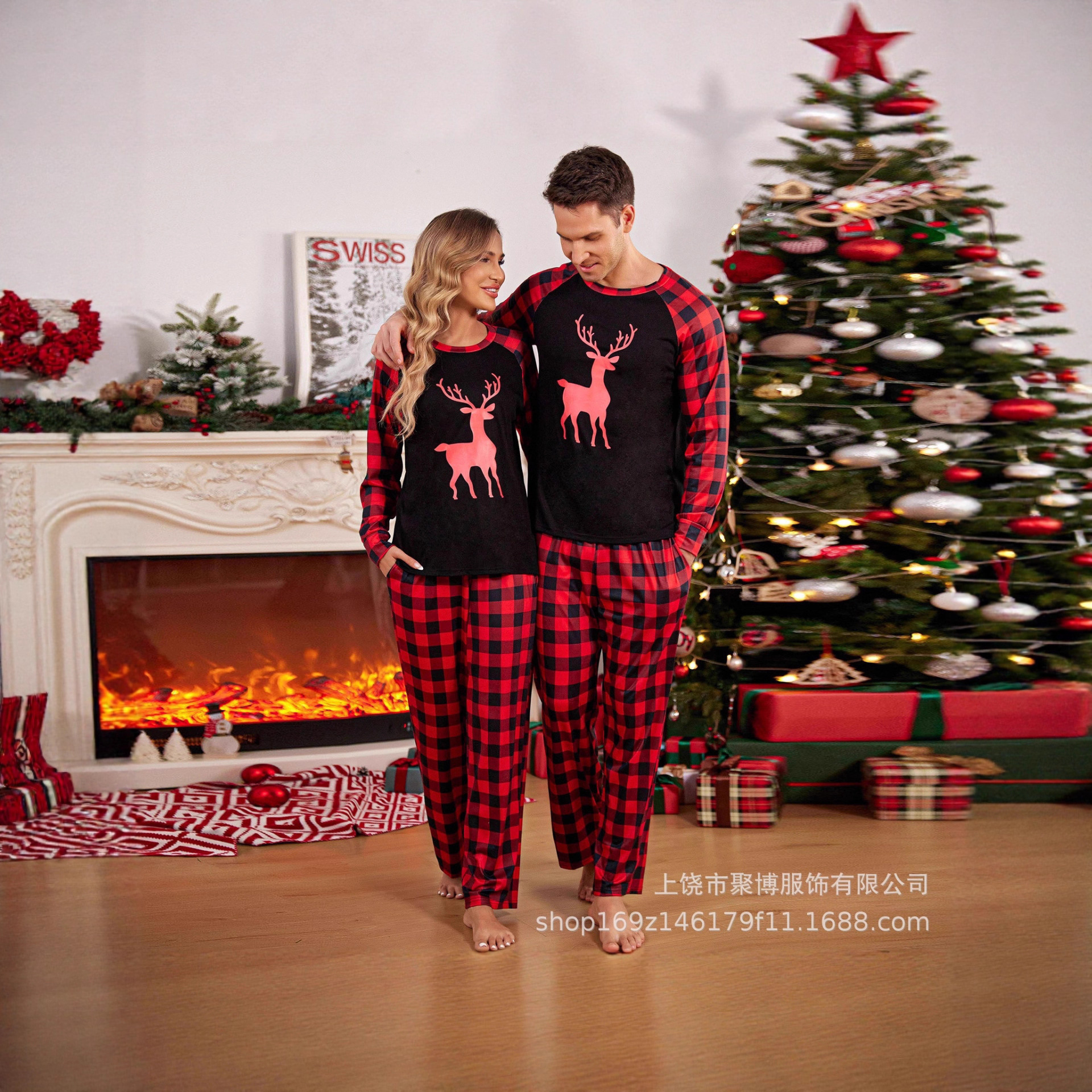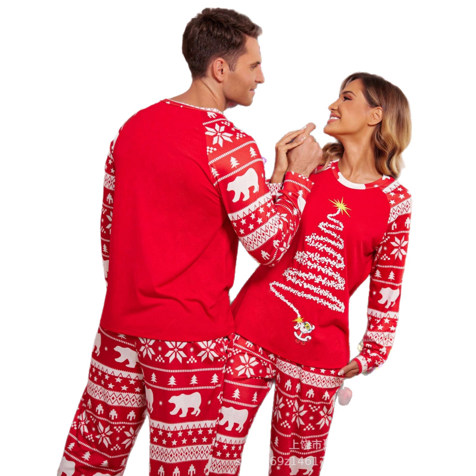 秋冬亚马逊欧美圣诞家居服长袖长裤圣诞印花男女同款单件套装睡衣