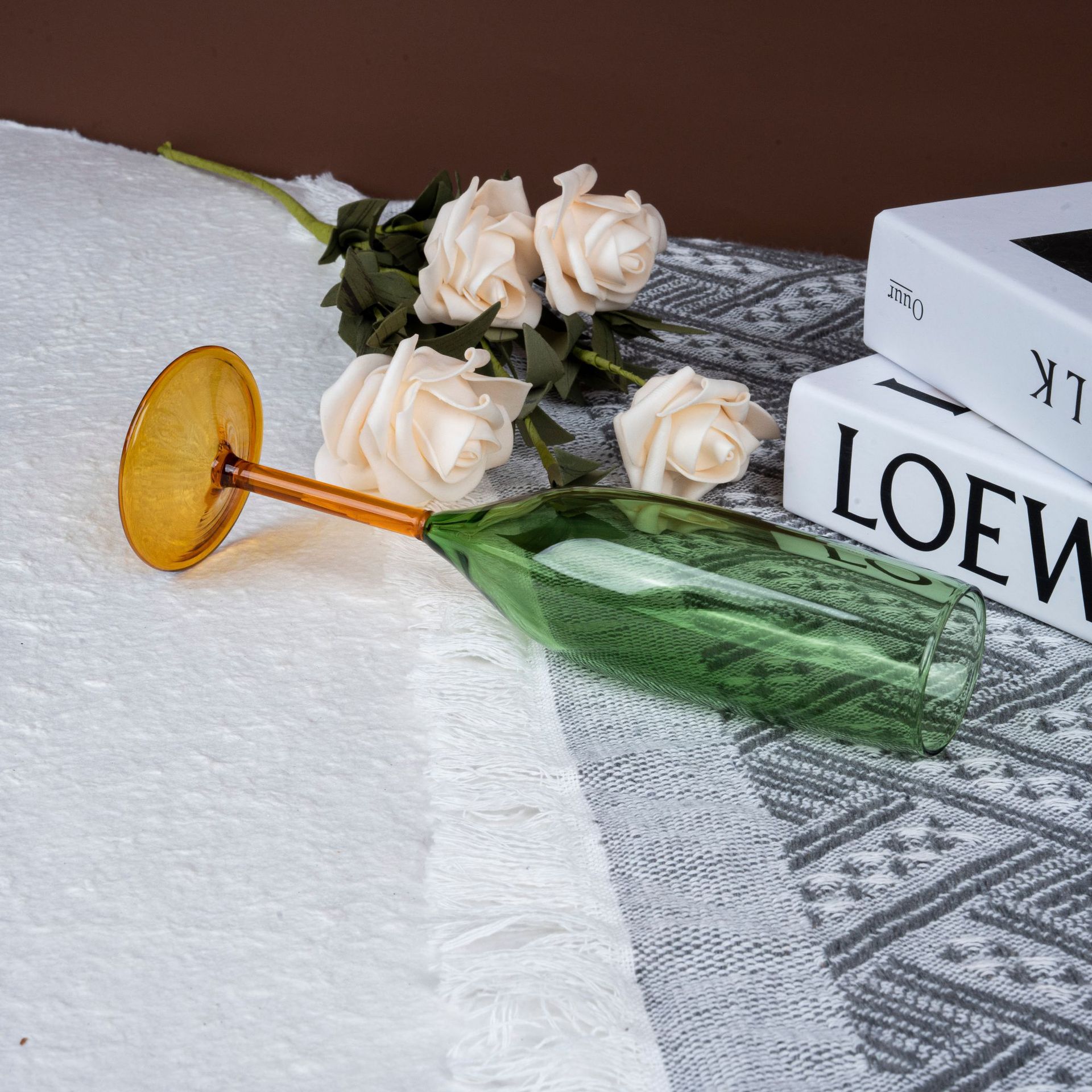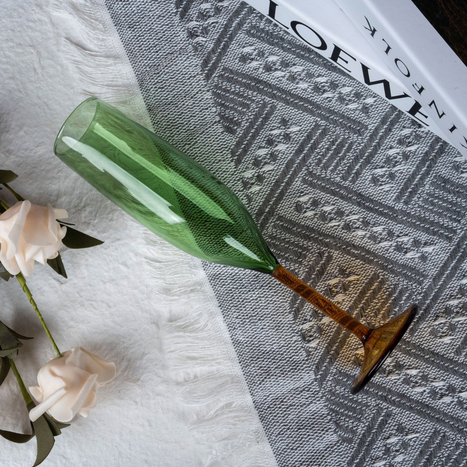 现代简约彩色高脚香槟杯琥珀底座浅绿杯身家用甜品杯酒杯