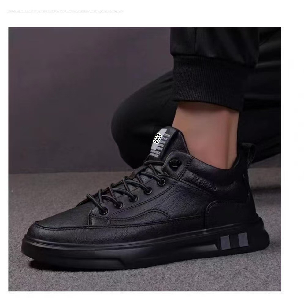 鞋子男2025新款秋季中帮黑色百搭软轻黑色皮面潮流男生休闲鞋批发