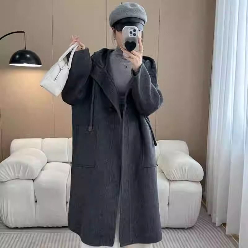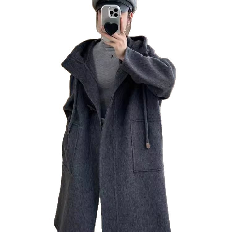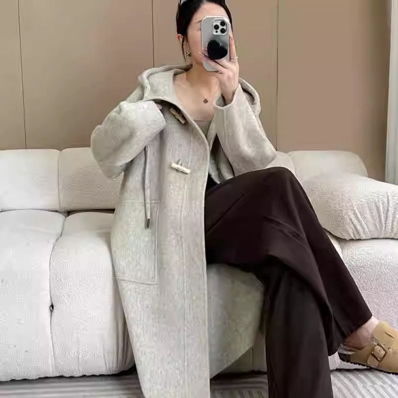 宽松通勤毛呢大衣2024秋冬款时尚连帽牛角扣中长款气质毛呢外套