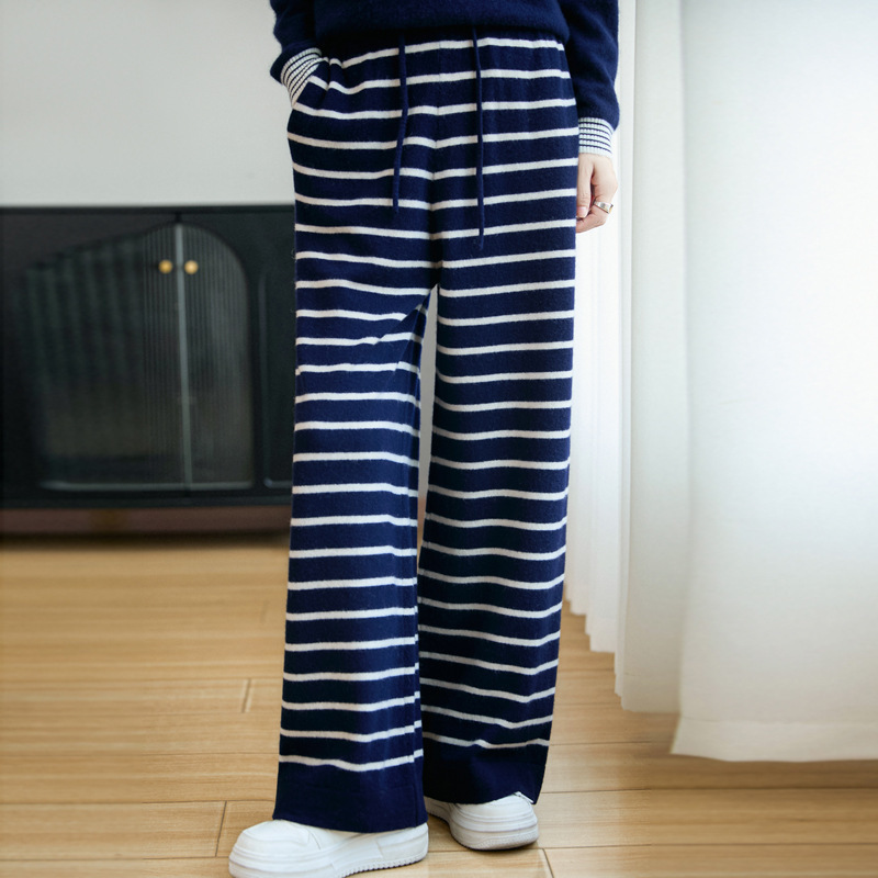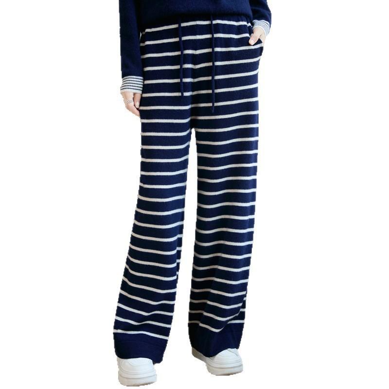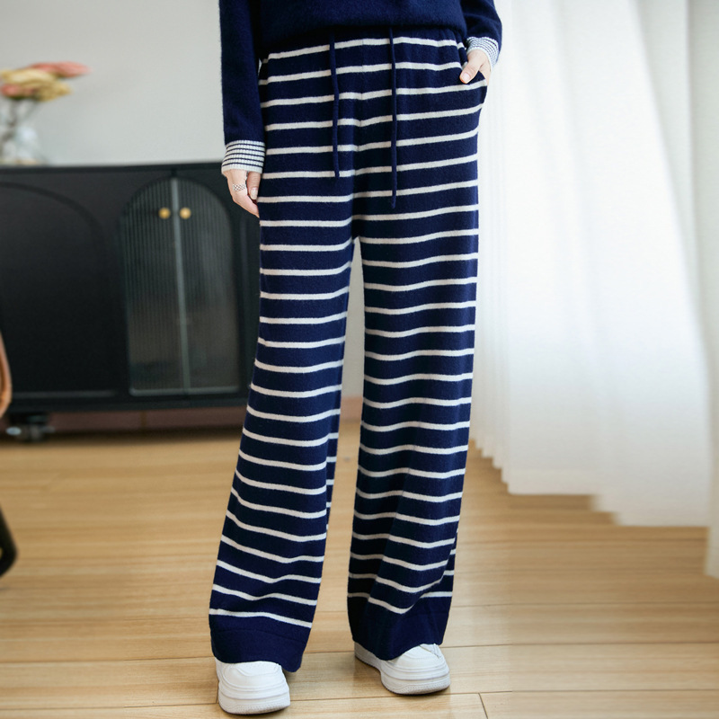 新款秋冬女100羊毛裤间色条纹简约设计感宽松慵懒风直筒裤子批发