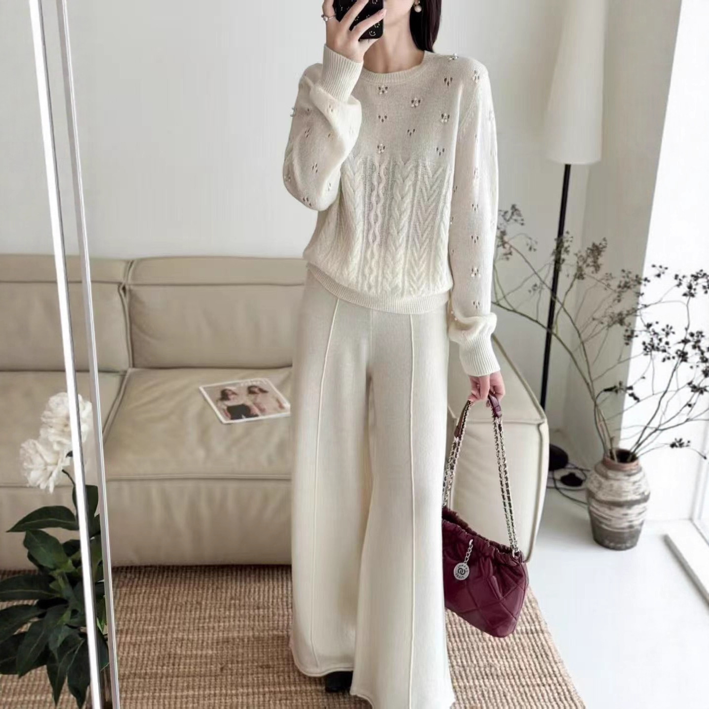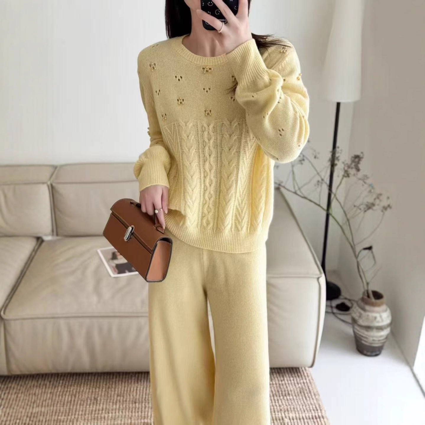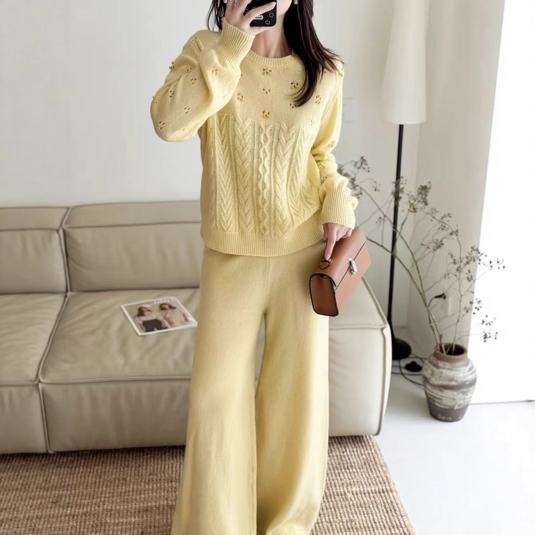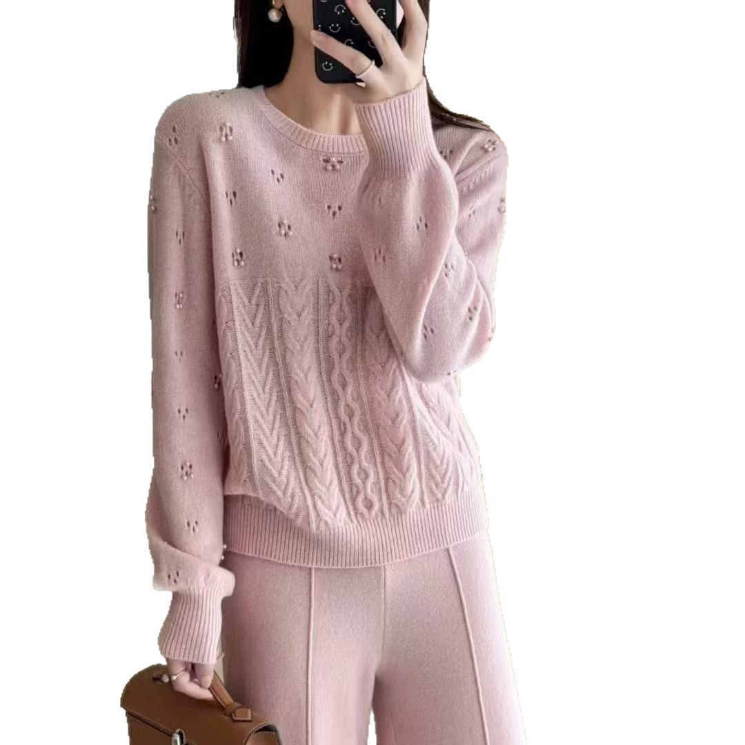 针织套装女高级感镂空温柔风圆领全毛秋季麻花宽松软糯针织毛衣裤