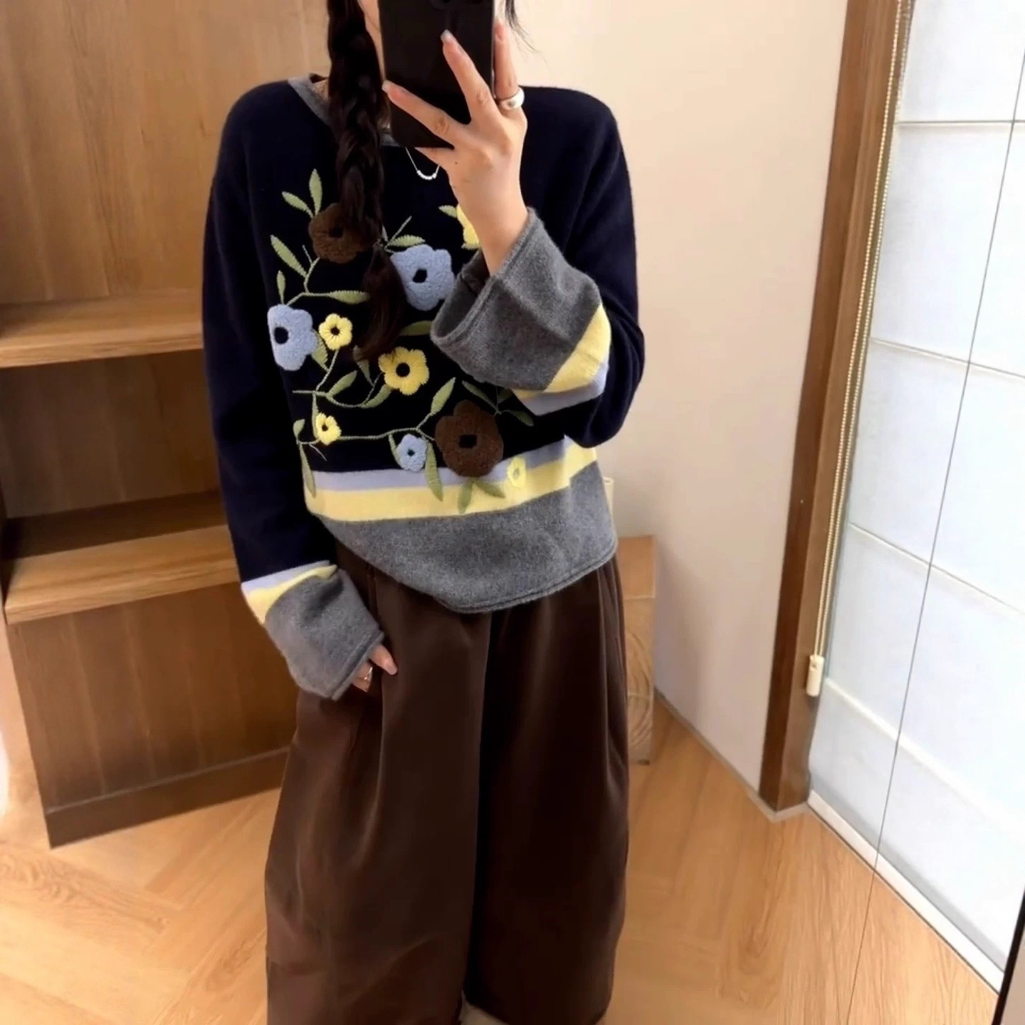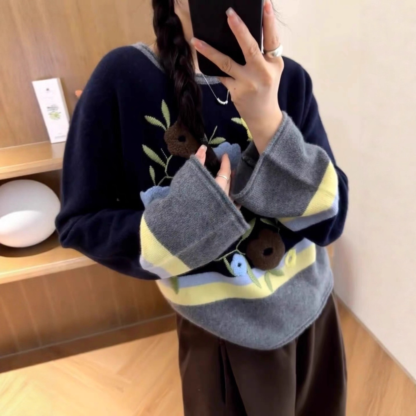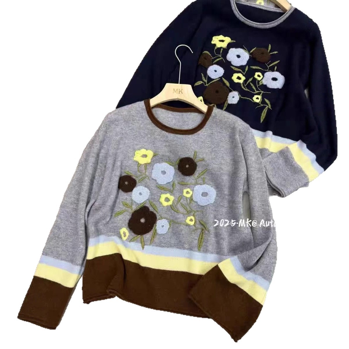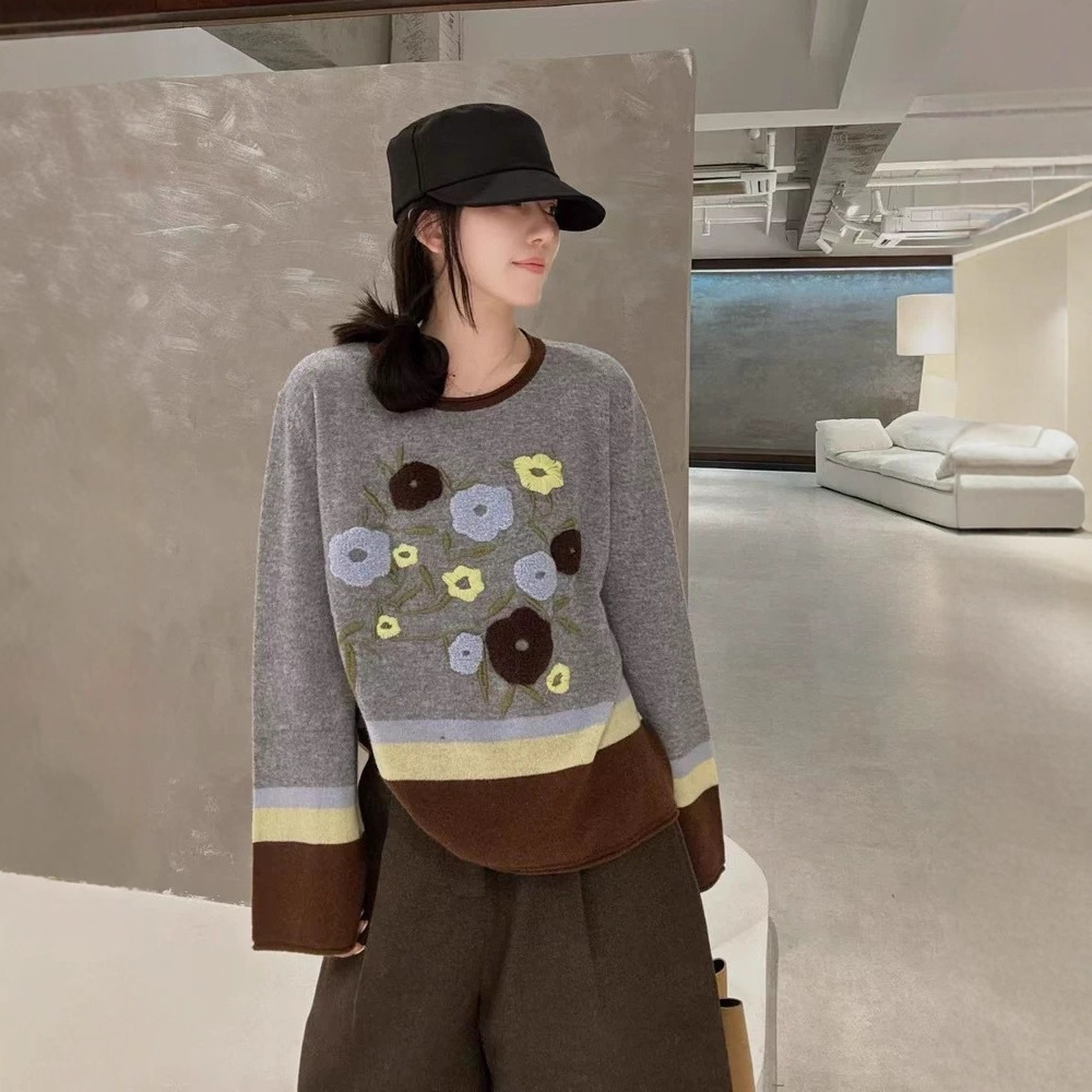 全毛针织衫女2025秋冬欧货圆领拼色慵懒氛围感花朵刺绣100%毛衣女