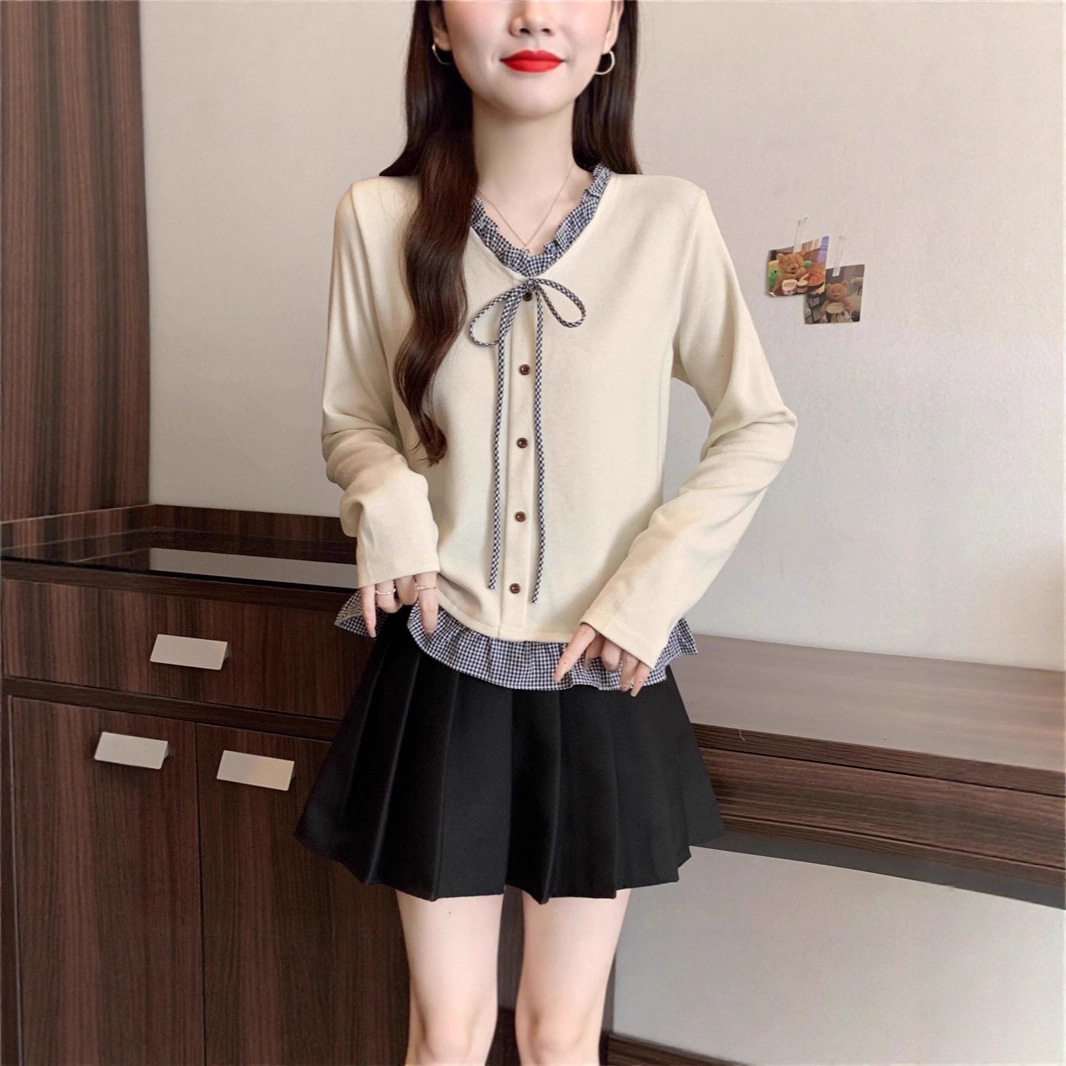 大码假两件边格子时尚拼接V领打底衫女春秋冬百搭显瘦长袖上衣女