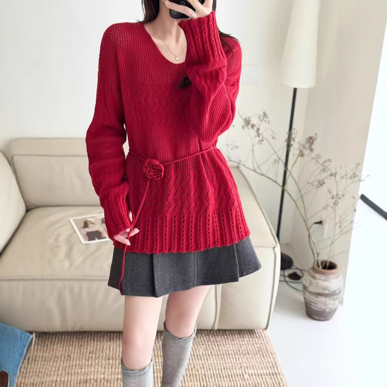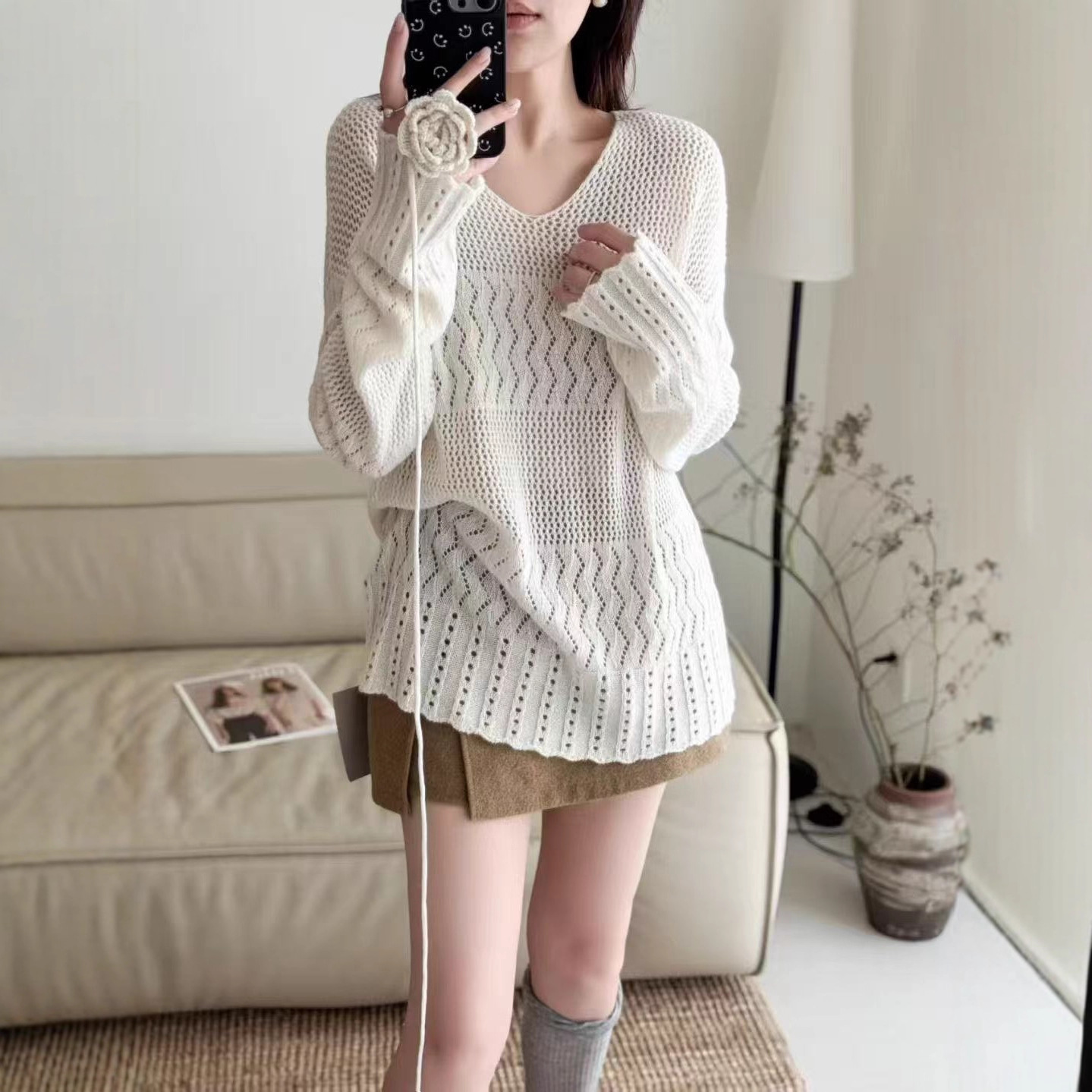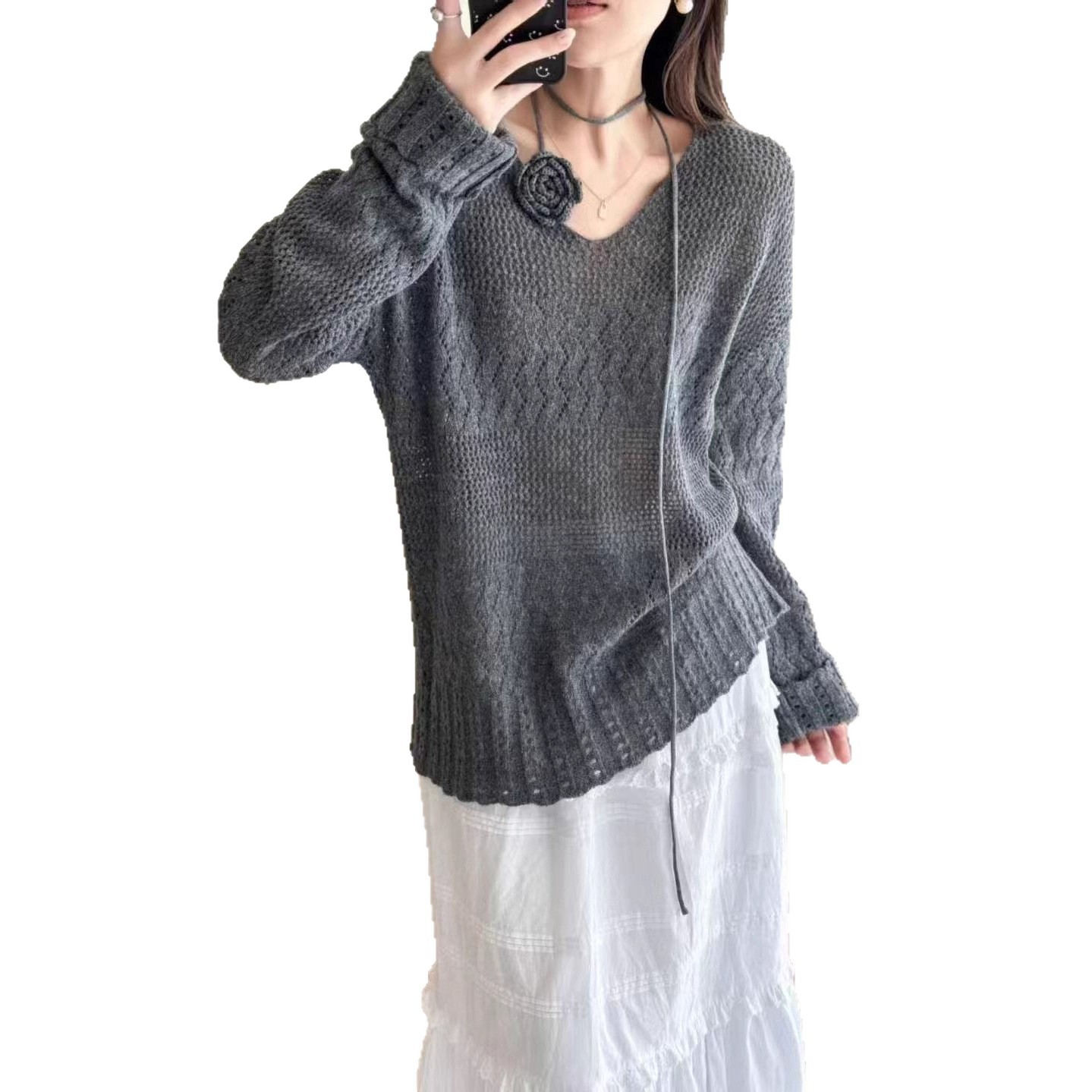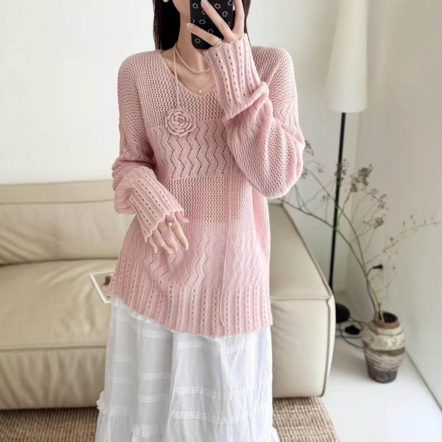 100%羊毛针织衫女2025秋冬季新款勾花镂空设计感V领纯色针织上衣