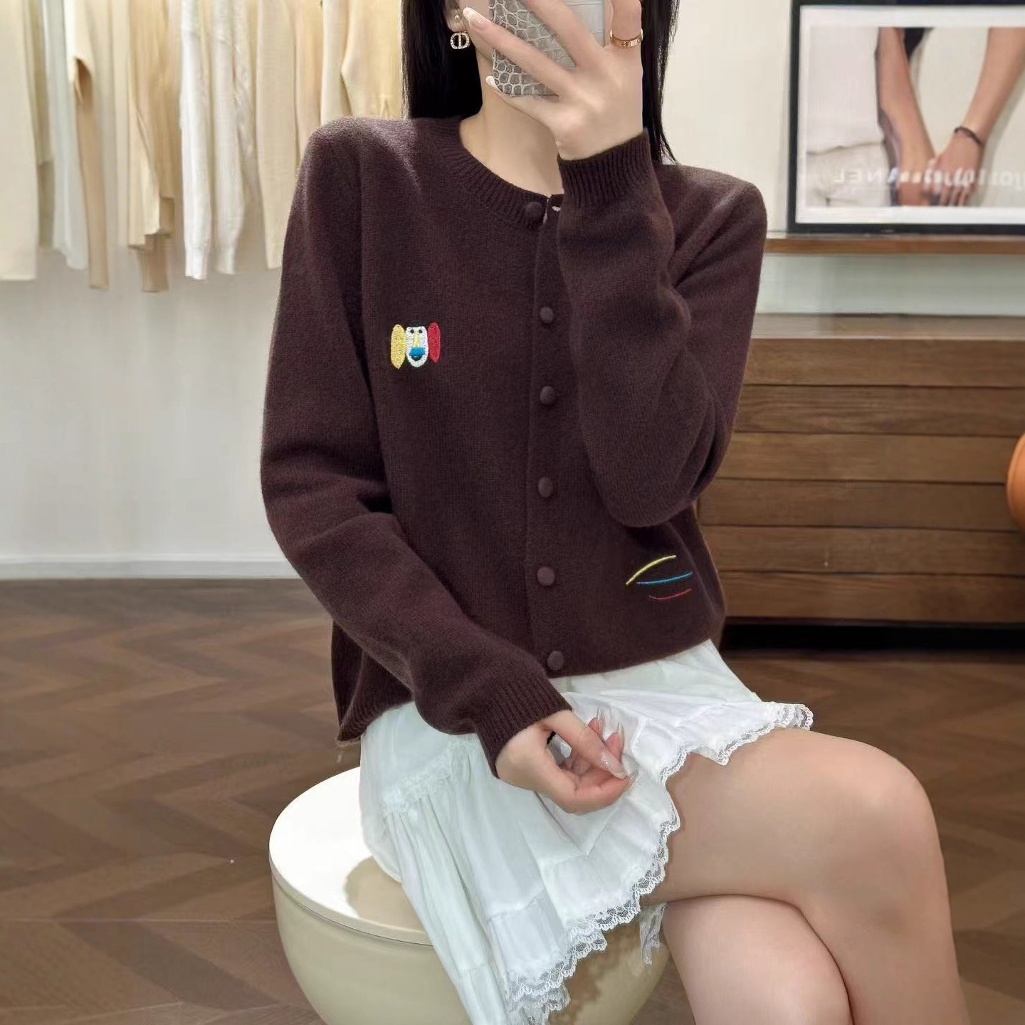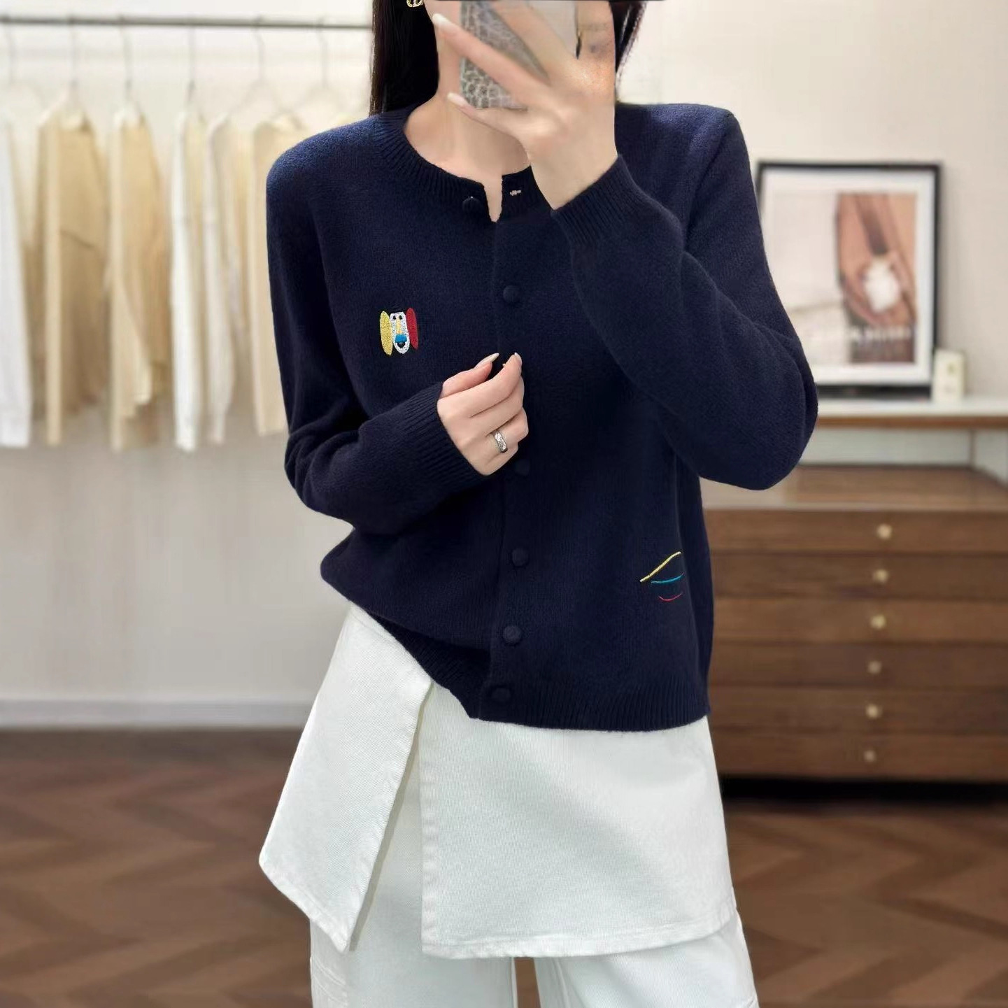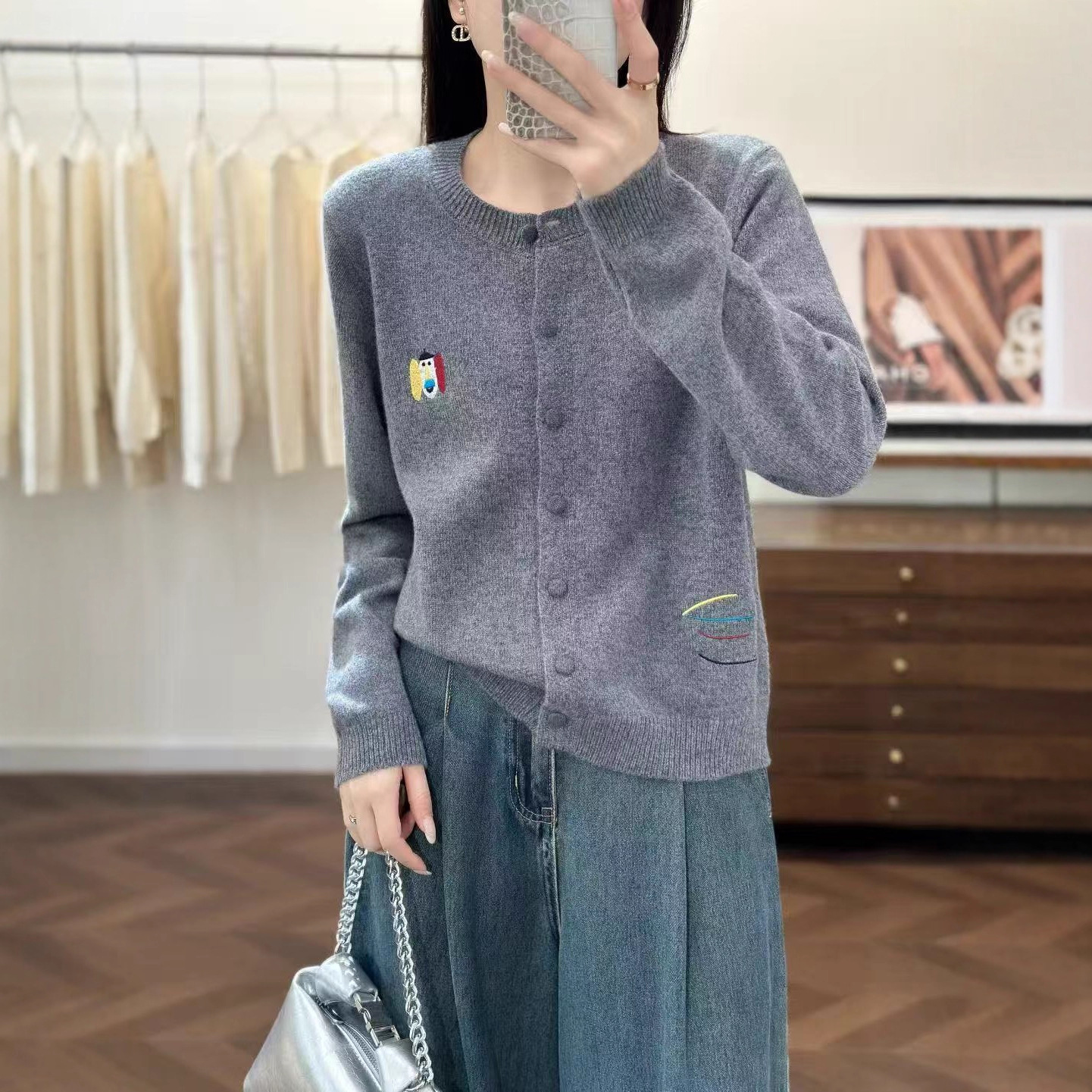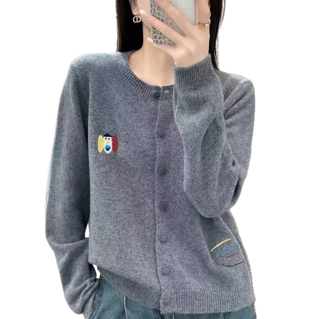 女装2025年秋新款圆领开衫彩色刺绣小马外套针织衫上衣全羊毛外搭