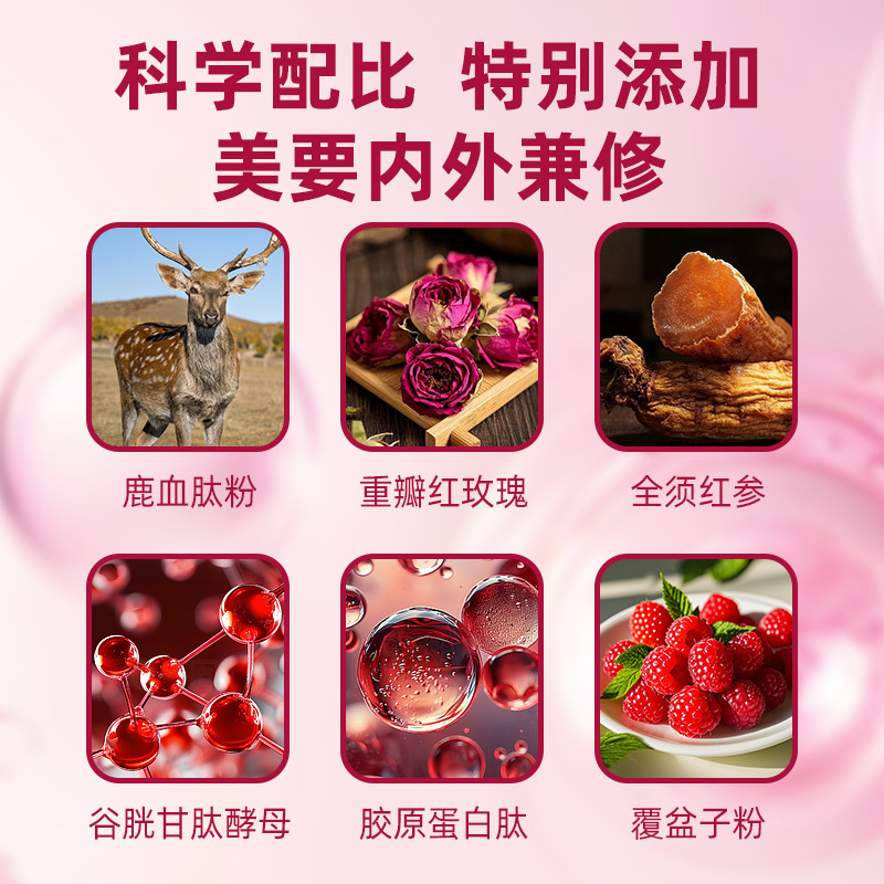 | 主要原料 | 葡萄籽油,明胶,甘油,水,重瓣红玫瑰植物饮品(水,重瓣红玫瑰)全须红参,萃尔美三型胶原蛋白肽,大豆油 | 生产日期 | 最新生产日期,请咨询客服 |