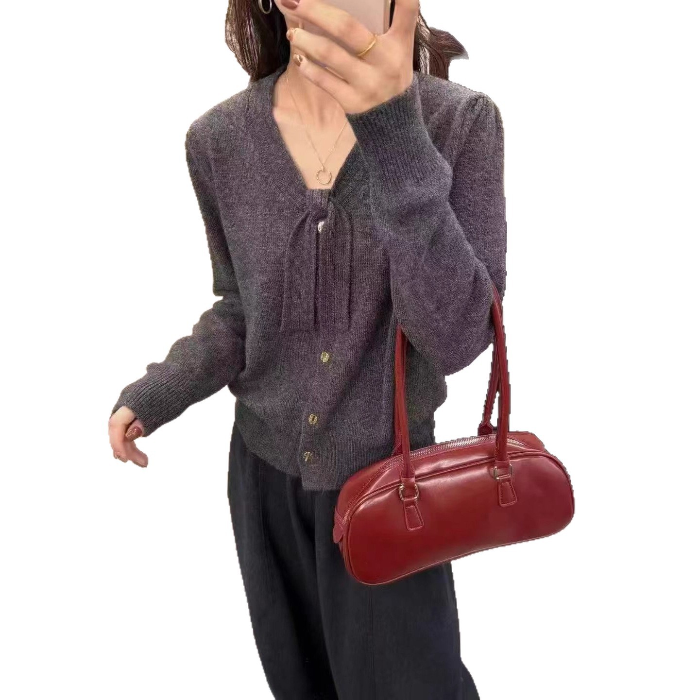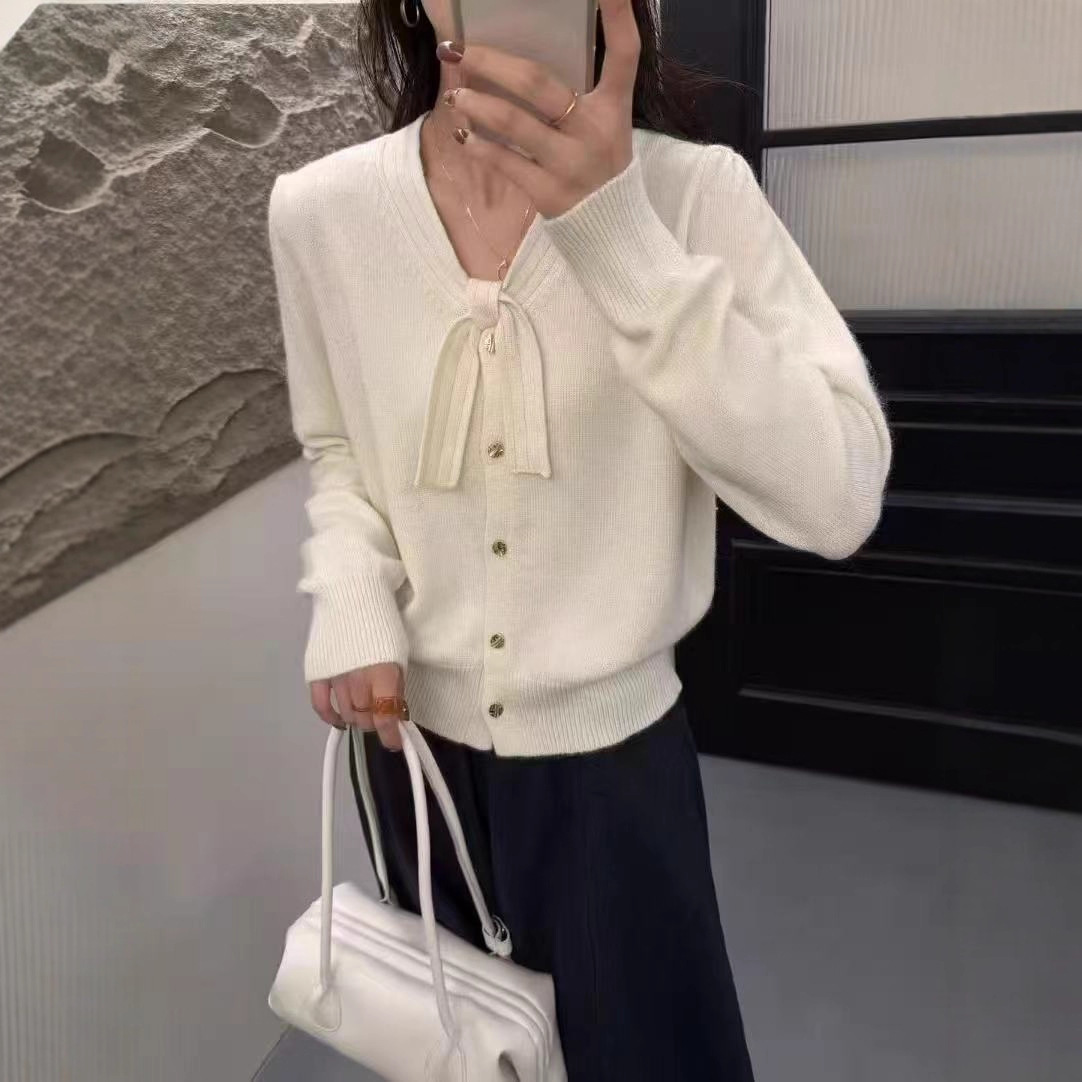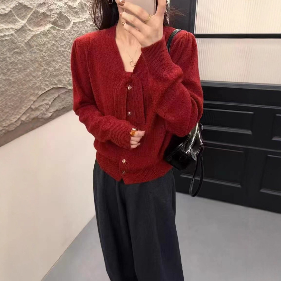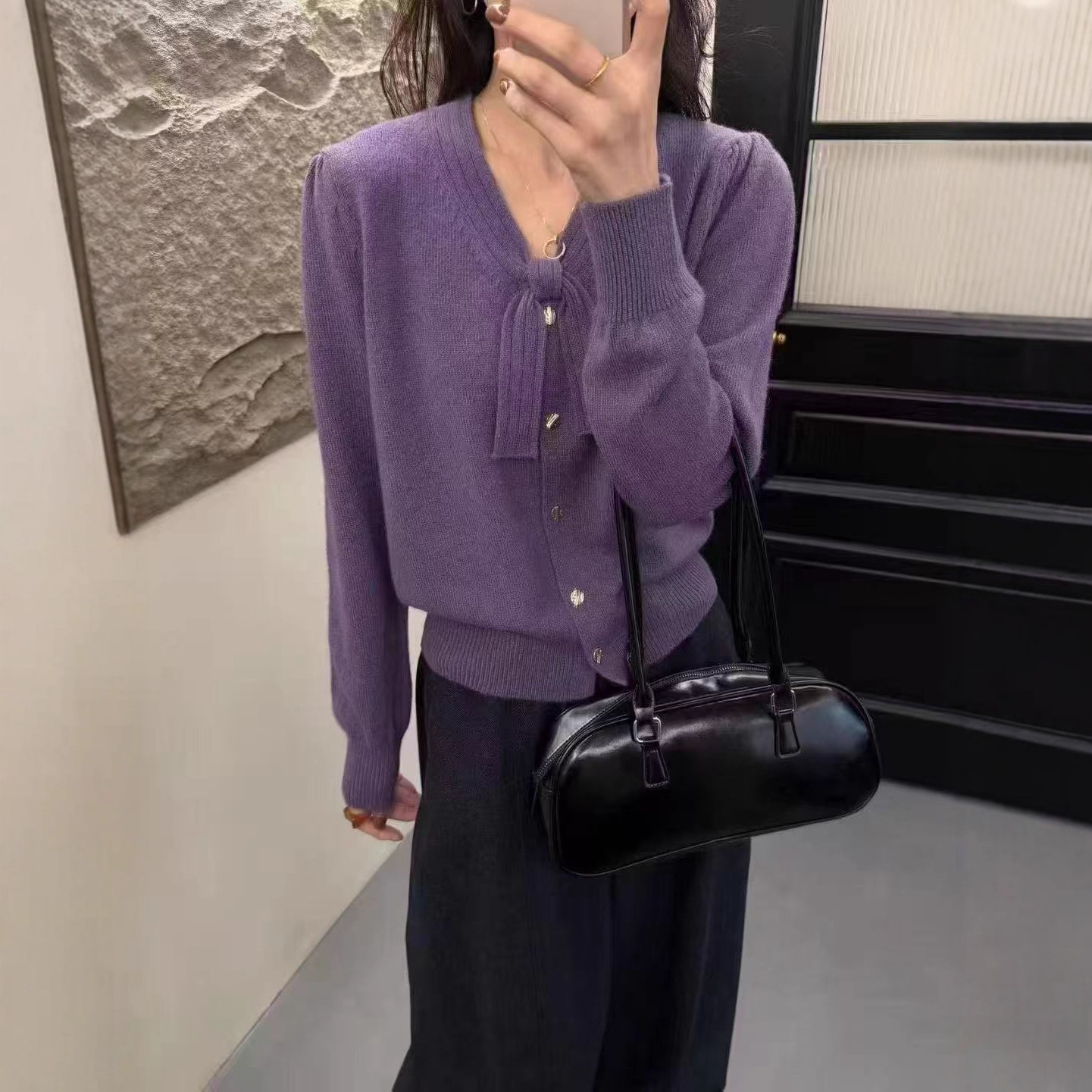 蝴蝶结毛衣女春秋2025新款设计感气质浣熊羊毛长袖短款上衣针织衫