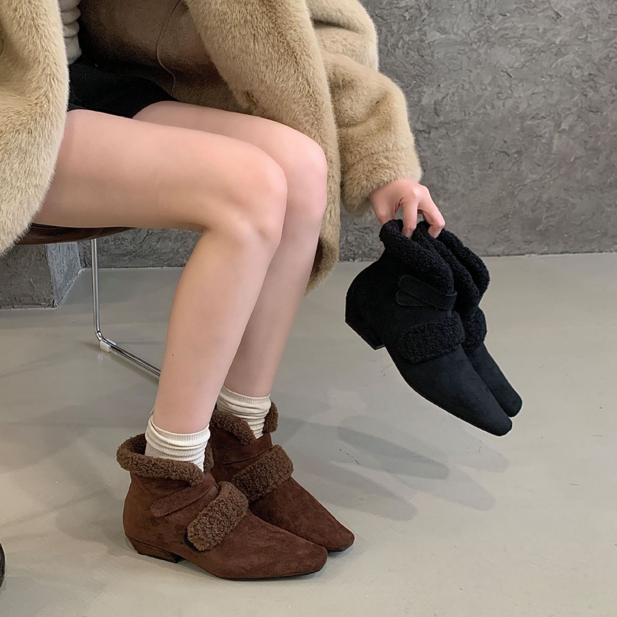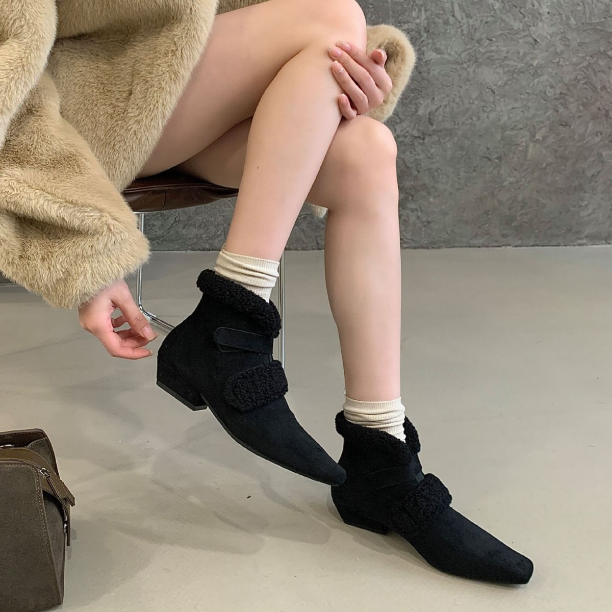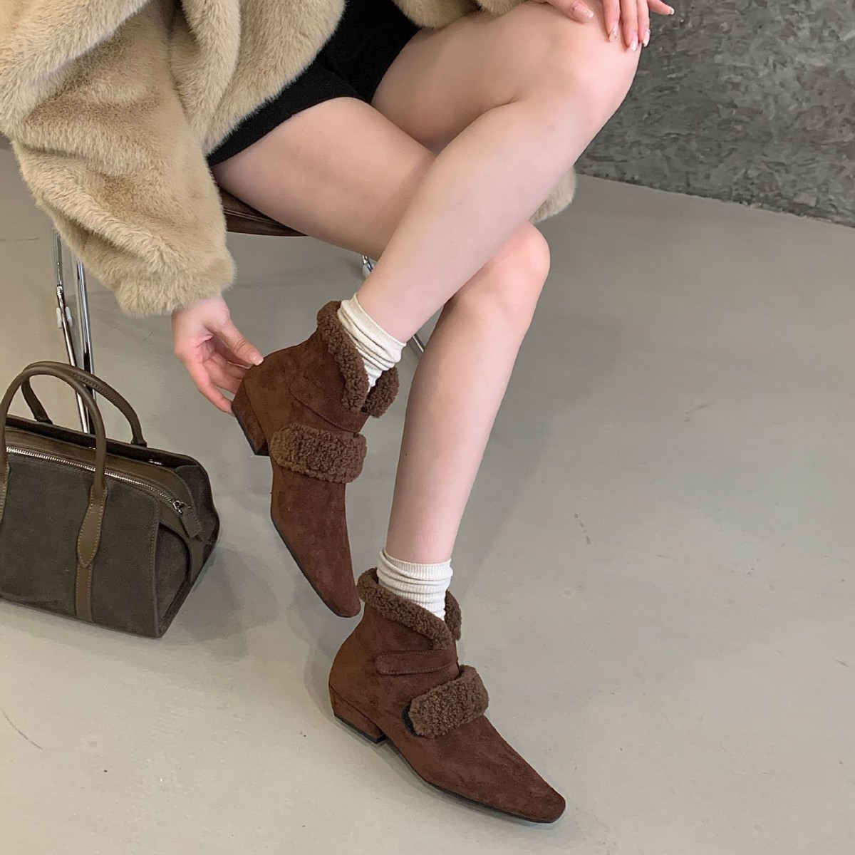 韩版绒面粗跟加绒短靴2025秋冬新款气质时尚棉鞋魔术贴保暖毛毛靴