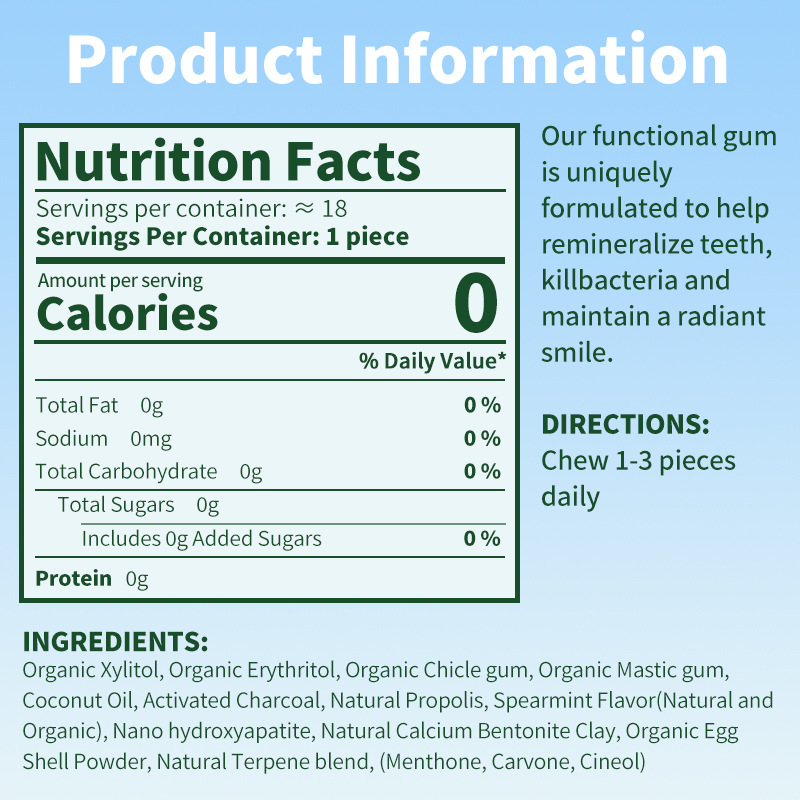 | 主要原料 | 有机木糖醇、有机赤藓糖醇、有机Chicle gum、有机乳香胶、椰子油、活性炭、天然蜂胶、Spear | 生产日期 | 最新日期,请咨询客服 |