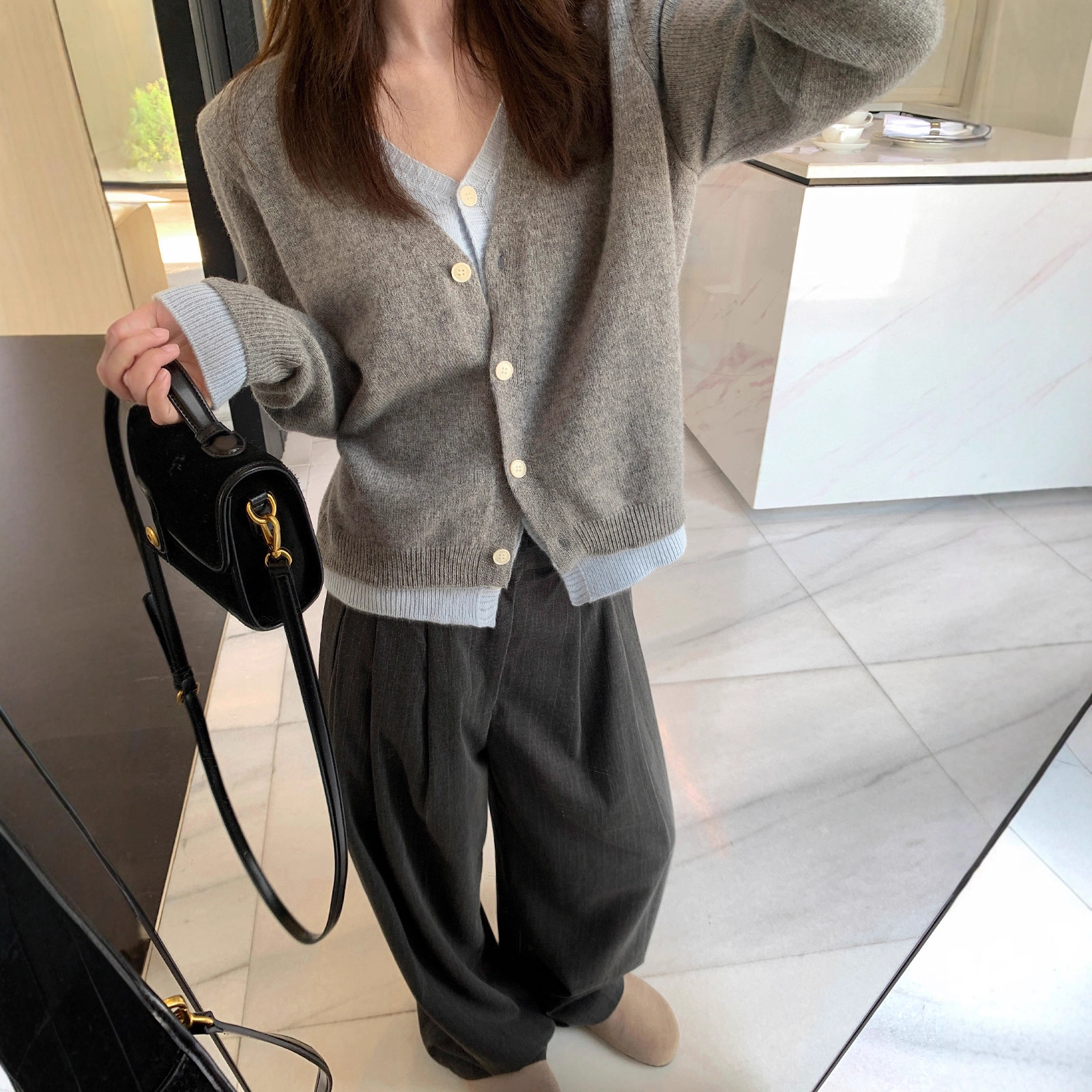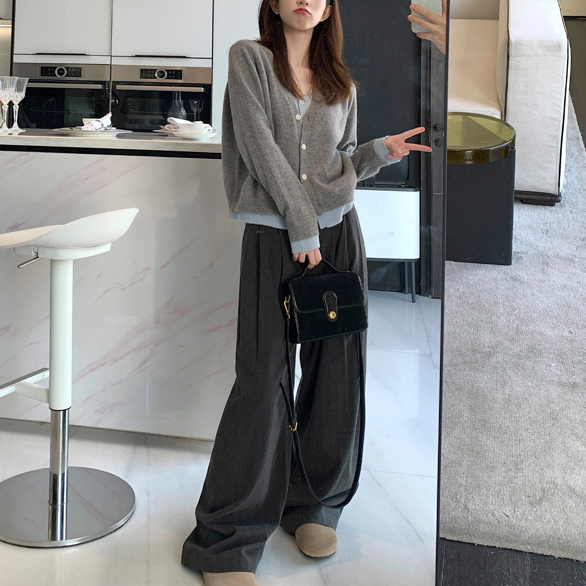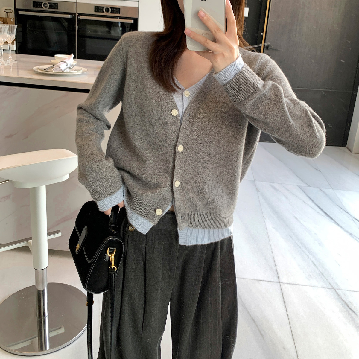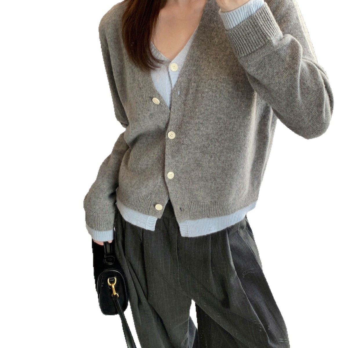 首尔印象100羊毛假两件v领针织开衫外套设计感撞色上衣工厂直销