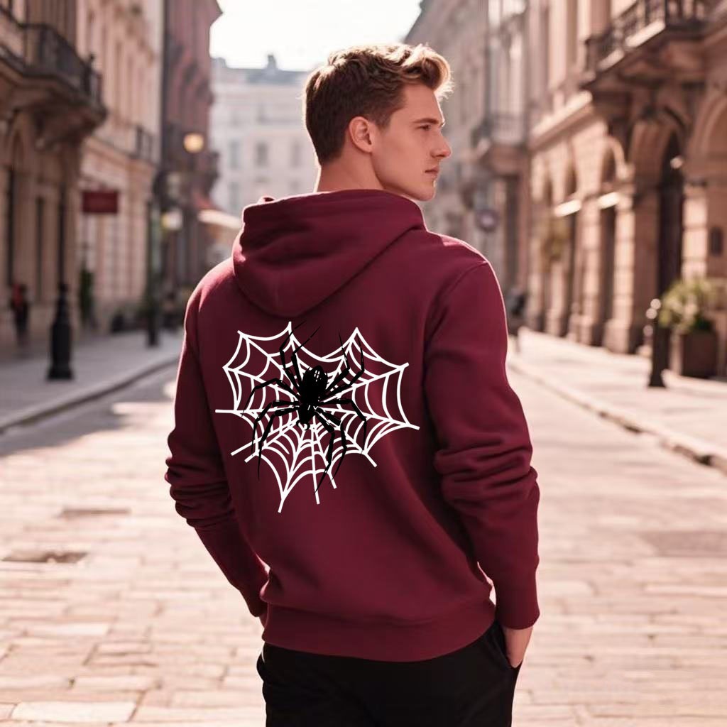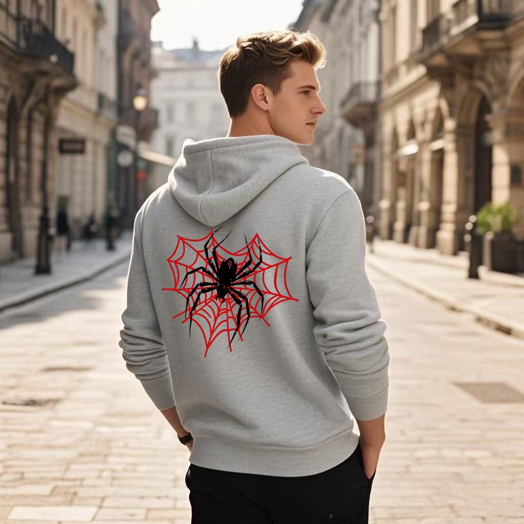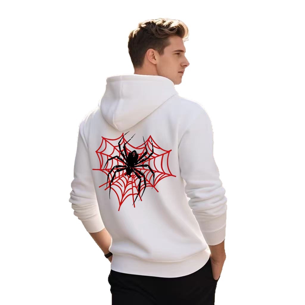 男士哥特风蜘蛛网与蜘蛛图案印花卫衣 - 黑色搭配红白蜘蛛设计,