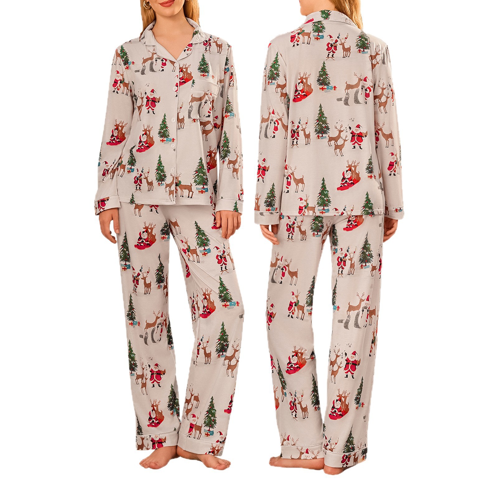 欧美秋冬女士家居服圣诞节印花长袖长裤开衫翻领睡衣休闲舒适POD