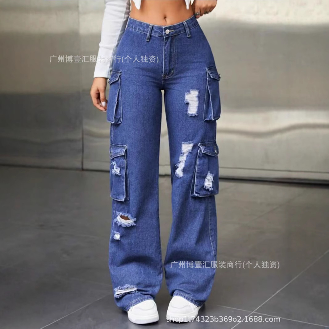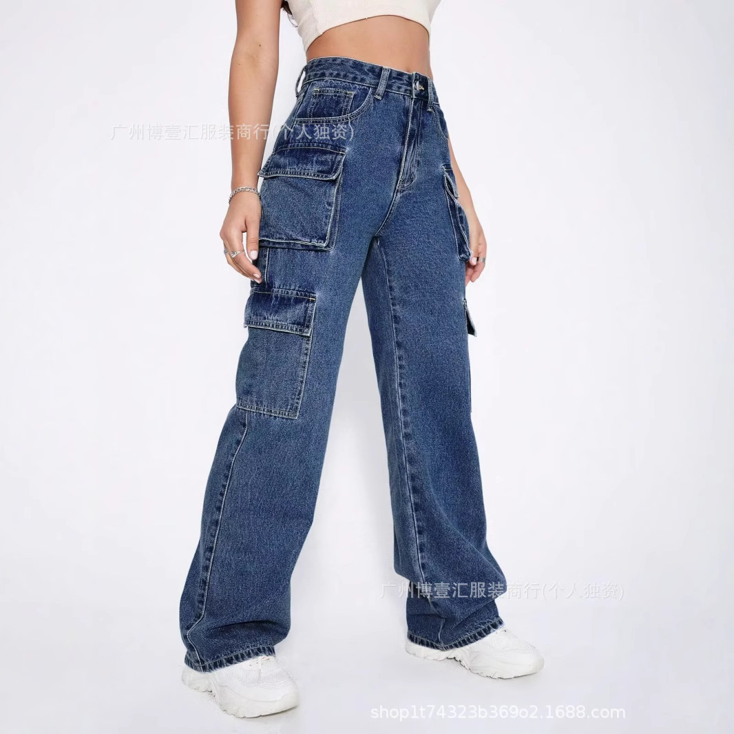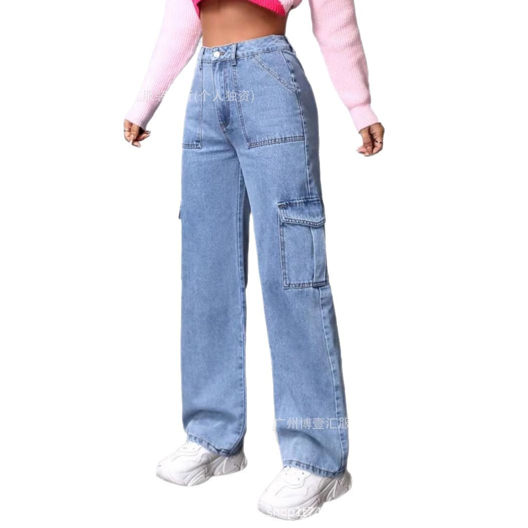 Cargo jeans女士牛仔工装长裤多口袋裤阔腿流行款Jeans wholesale