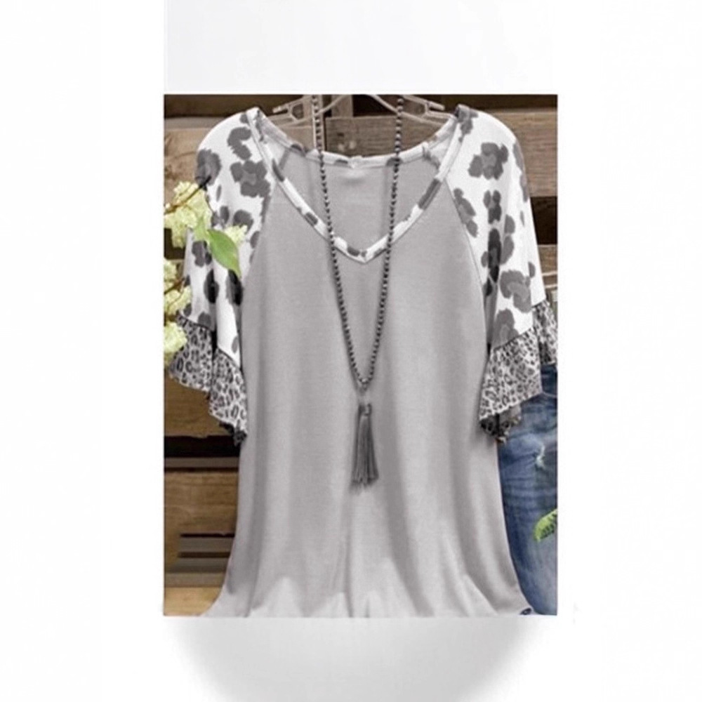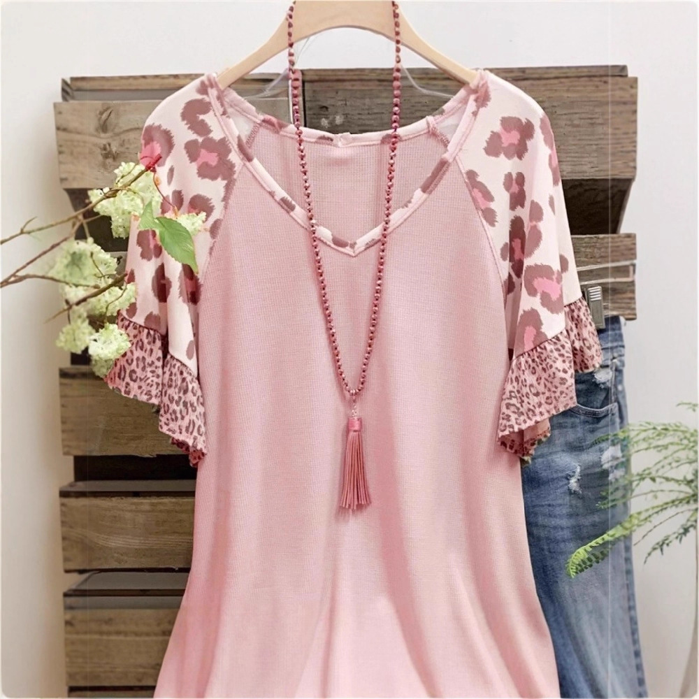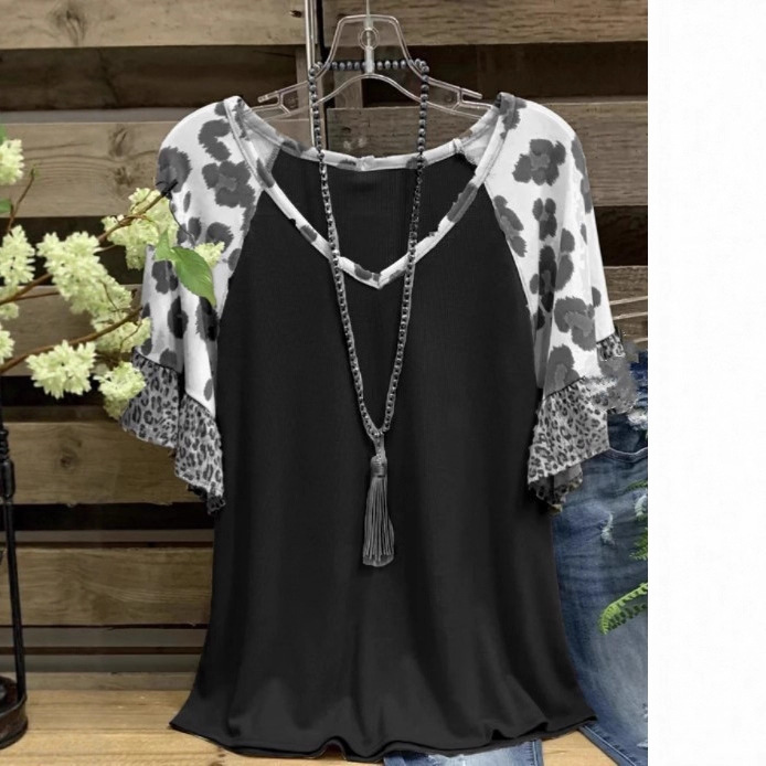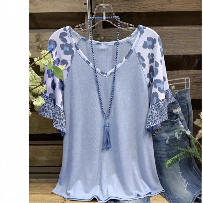 欧美跨境夏季新款 女士华夫格V领豹纹拼接五分袖T恤上衣女