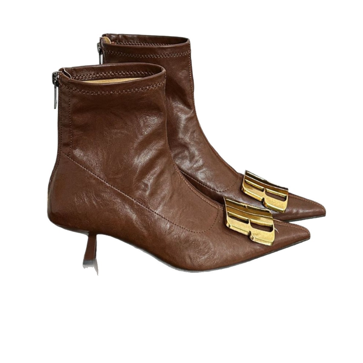 2025秋冬新款尖头猫跟法式细跟女短靴金属扣子时尚百搭皮质瘦瘦靴