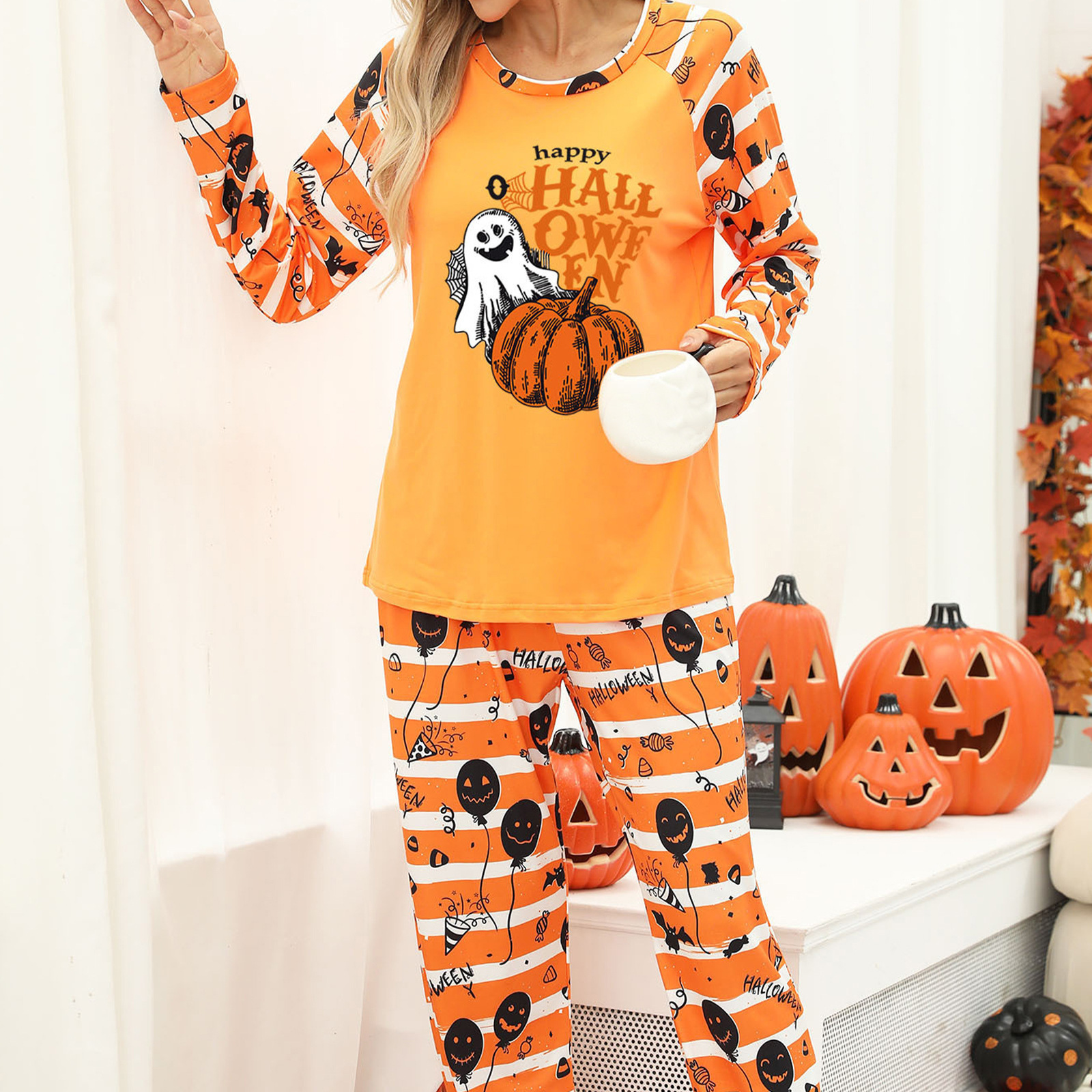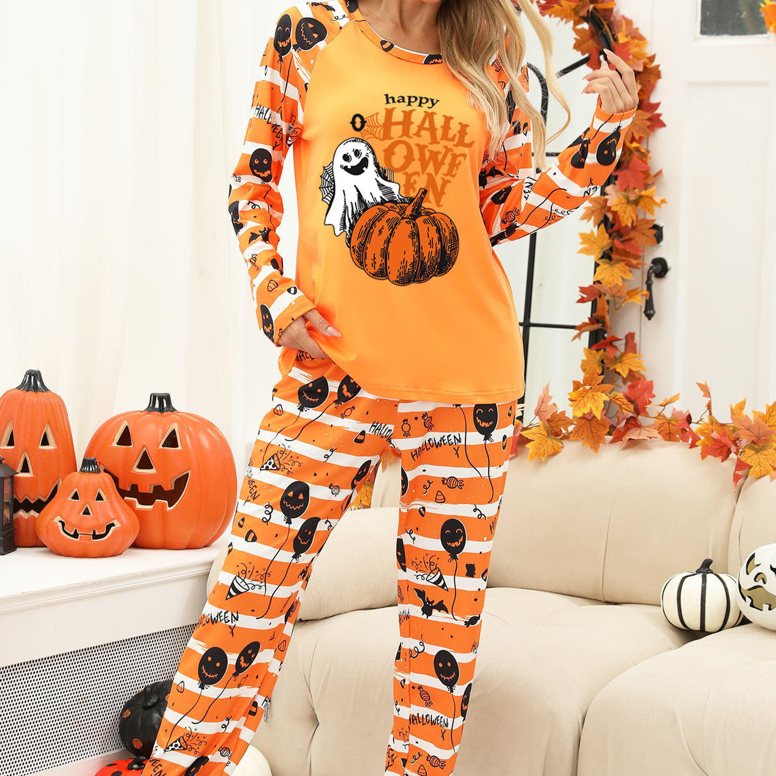 厂家直销女装家居服欧美两件套分体家居服睡衣万圣节南瓜印花POD