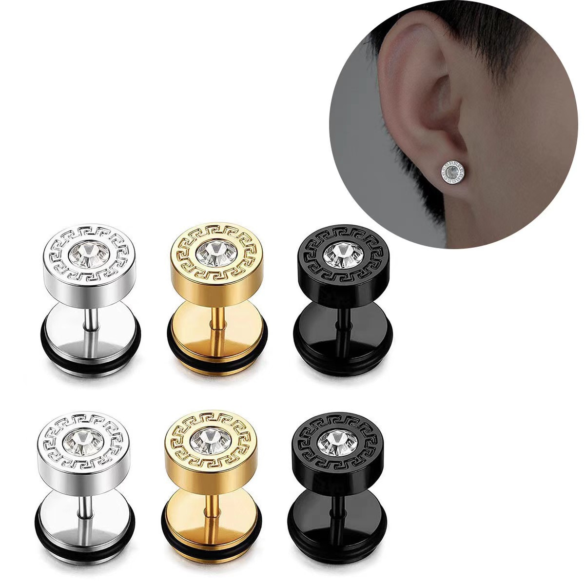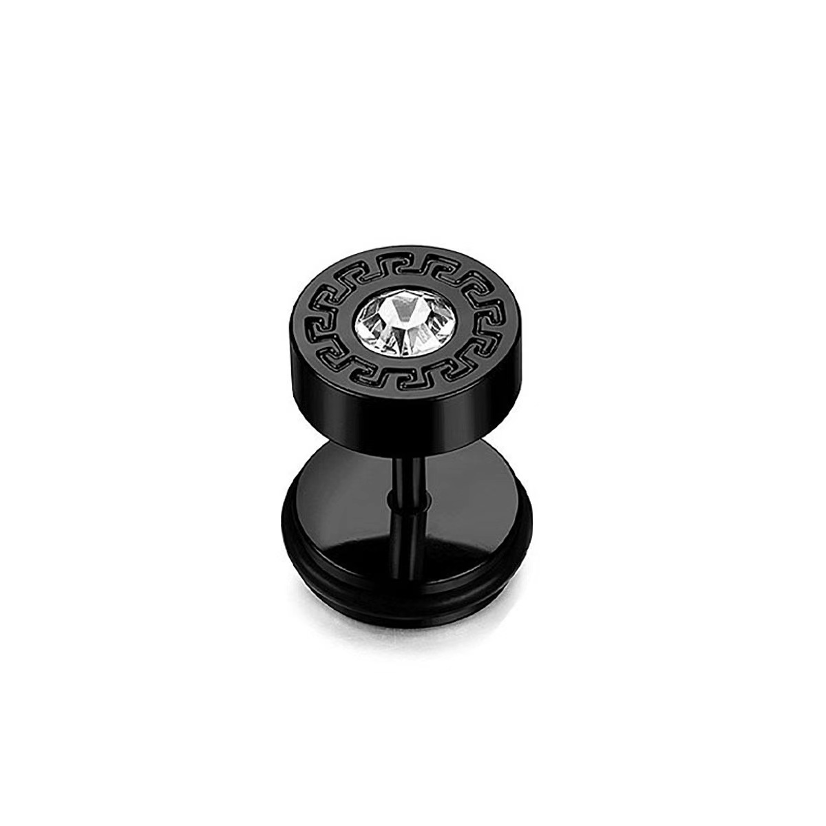 跨境时尚复古锆石钛钢个性男女长城纹耳钉批发热卖黑白耳饰厂家