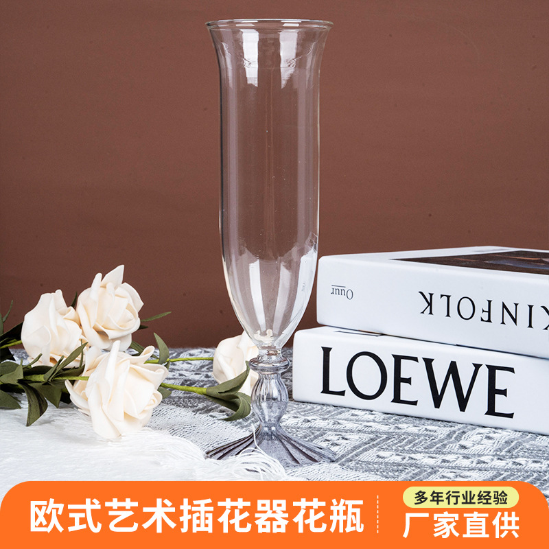 复古高脚透明玻璃花瓶 欧式艺术插花器 客厅餐桌装饰摆件 干花鲜