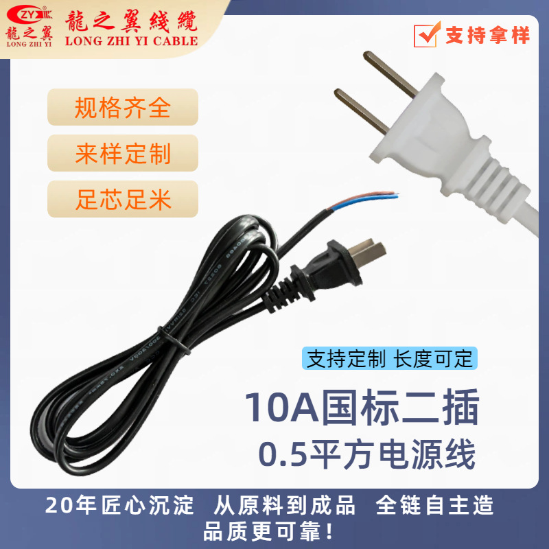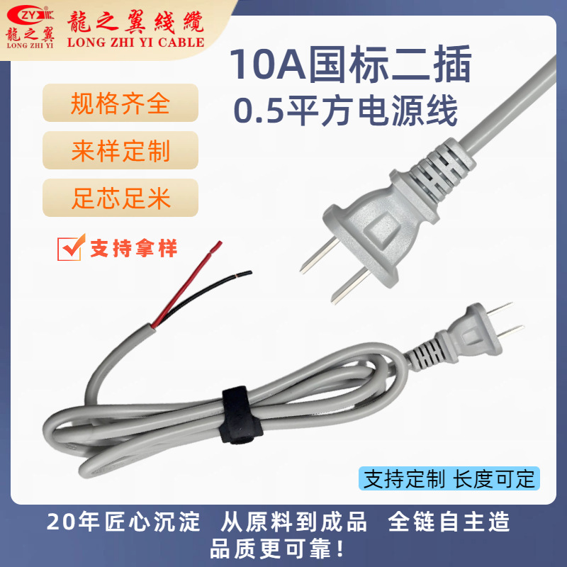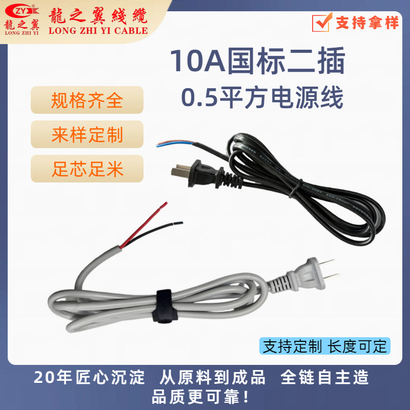 纯铜10A国标二插电源线工业设备通用两芯插头线源头工厂长度可定