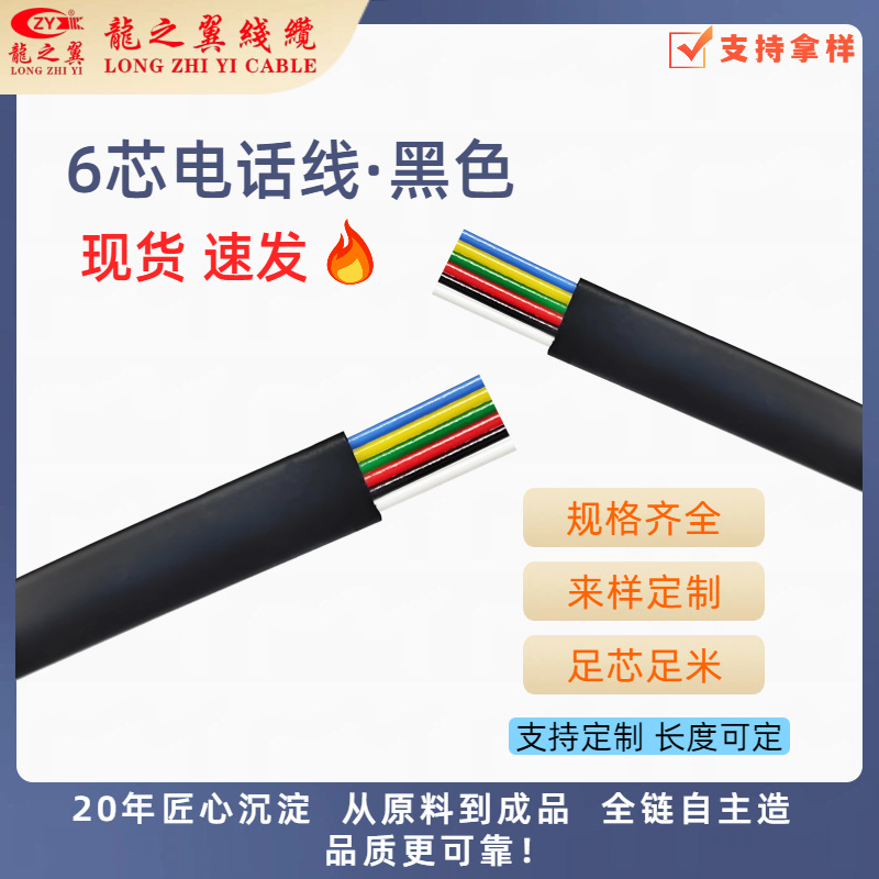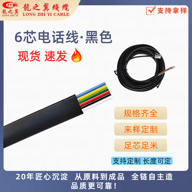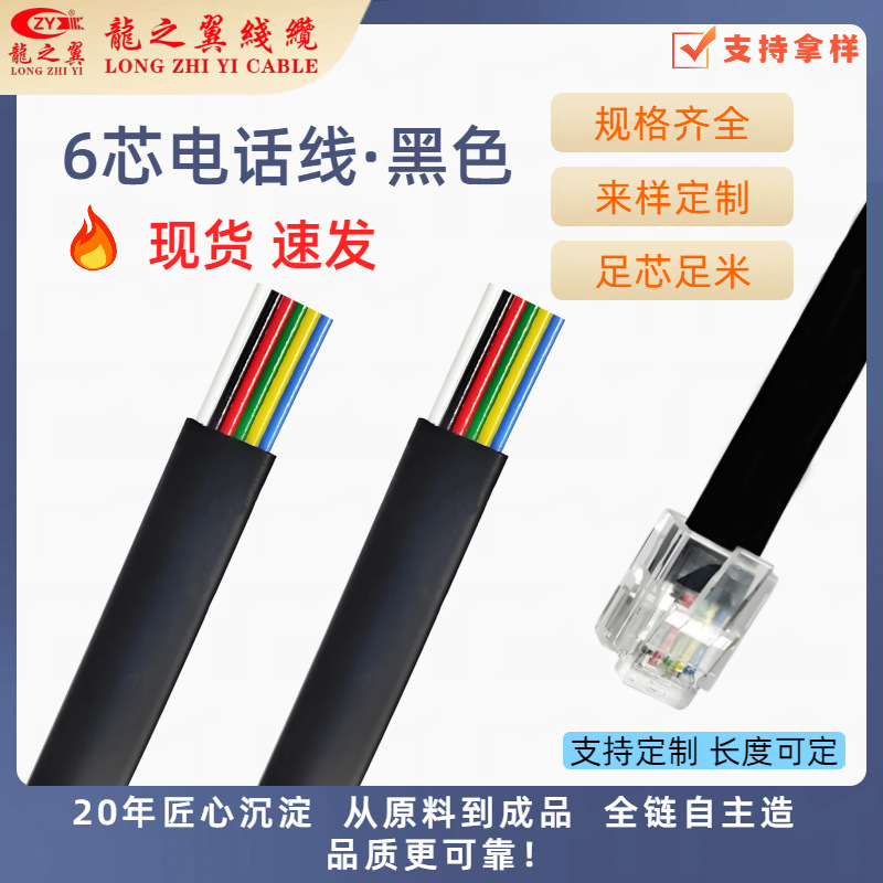 现货6芯电话线黑色扁平通信线适配RJ11/12电话线通用可加工水晶头