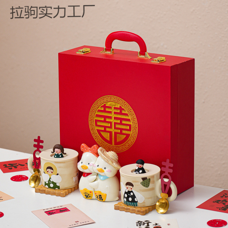 颜色甜漫佳偶-喜字对杯+大喜杯垫+抱抱鸭-木质礼盒装
