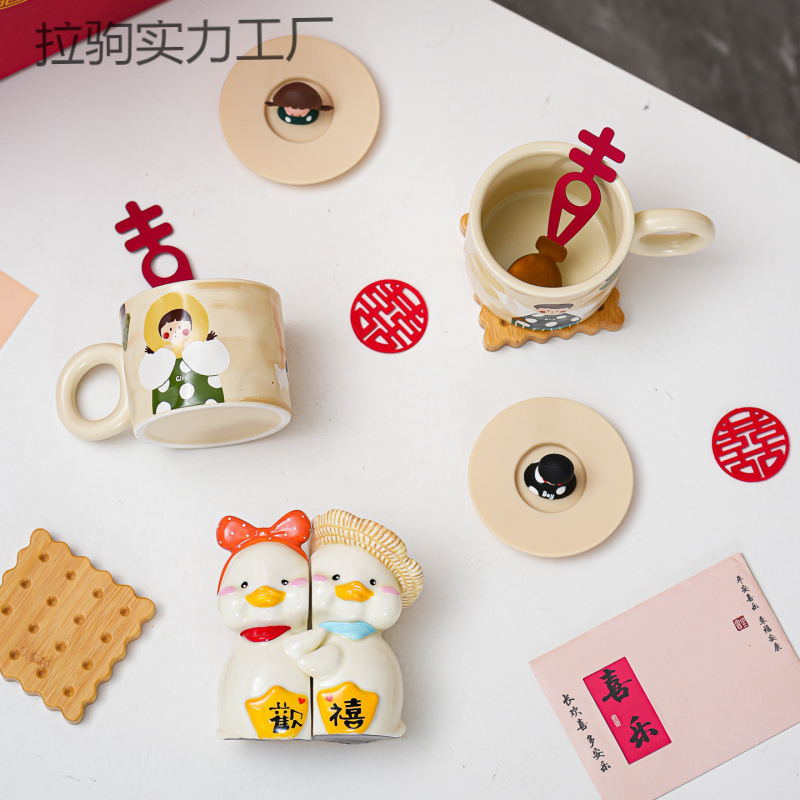 颜色甜漫佳偶-漫画杯+杯盖+饼干杯垫+抱抱鸭-木质礼盒装