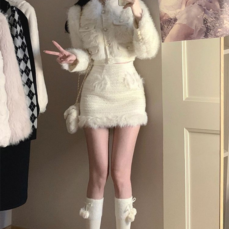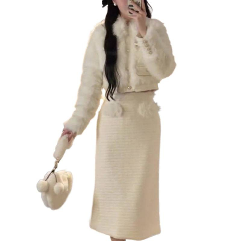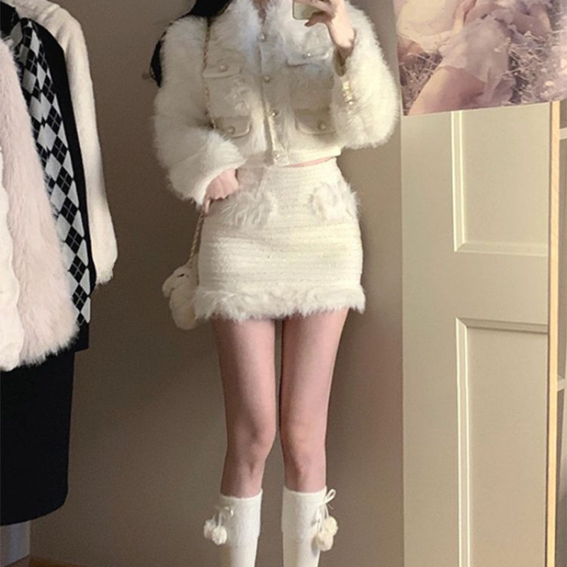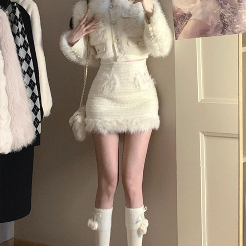 法式小香风加厚毛毛外套短裙时尚套装女秋冬季新款温柔两件套女