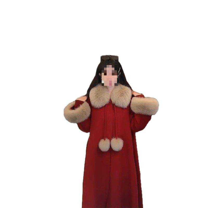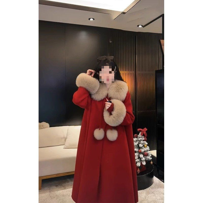 新年红色呢子大衣女秋冬新款斗篷加厚毛领中长款时尚毛呢外套