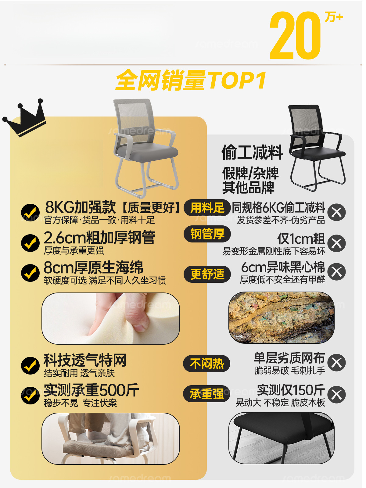 颜色 | 【弓形脚】黑框 灰网+乳胶坐垫(宽厚腰拖)加固横撑 | | 颜色 | 【弓形脚】白框 黑网+乳胶坐垫(宽厚腰拖)加固横撑 |