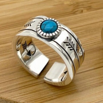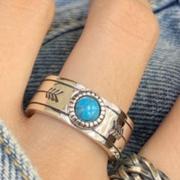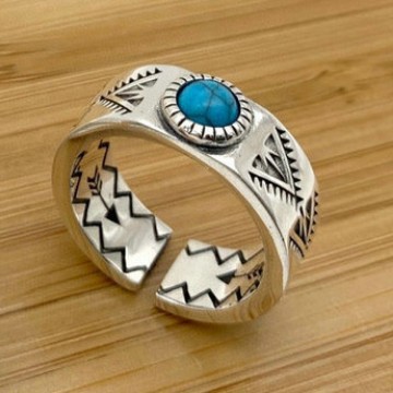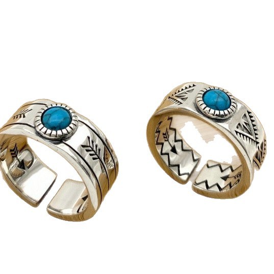 戒指男女款素圈镀银饰品复古印第安风图腾镶嵌仿绿松指环手饰跨境