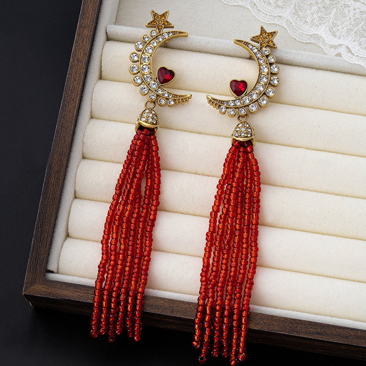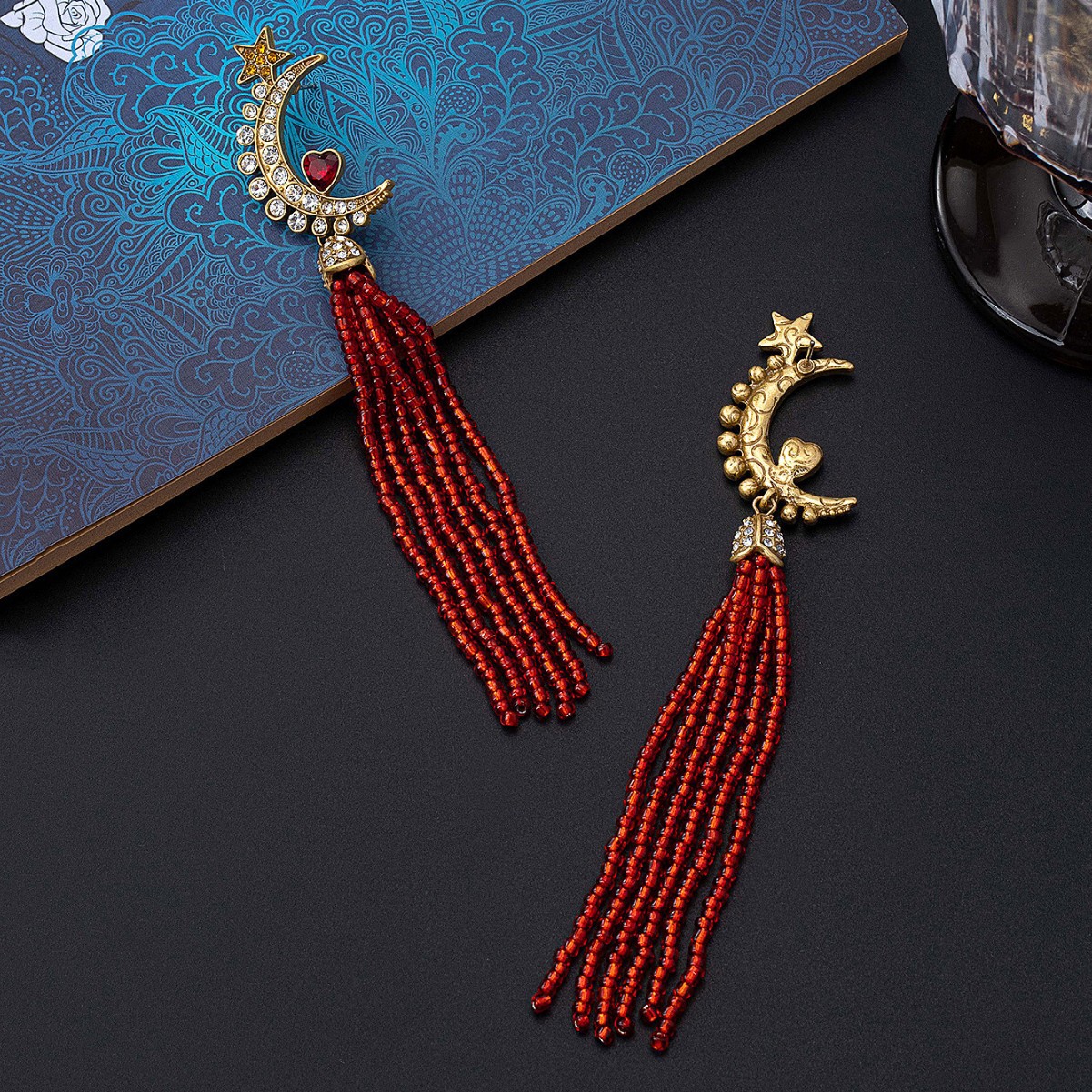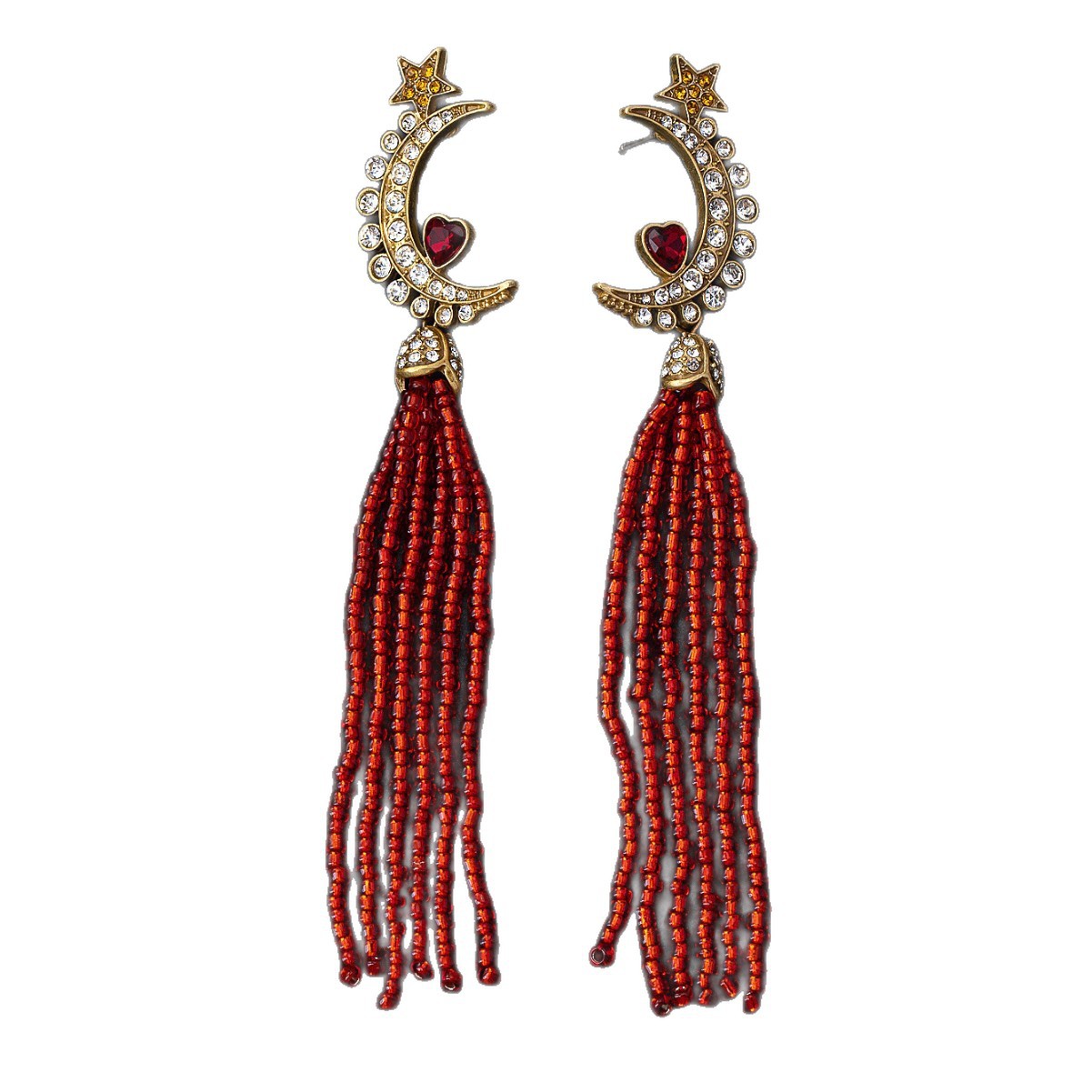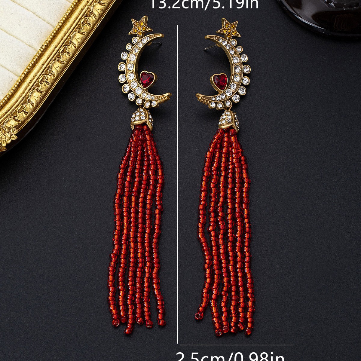 中古vintage宫廷风欧美复古月亮流苏星星红心点缀高级镶钻耳坠