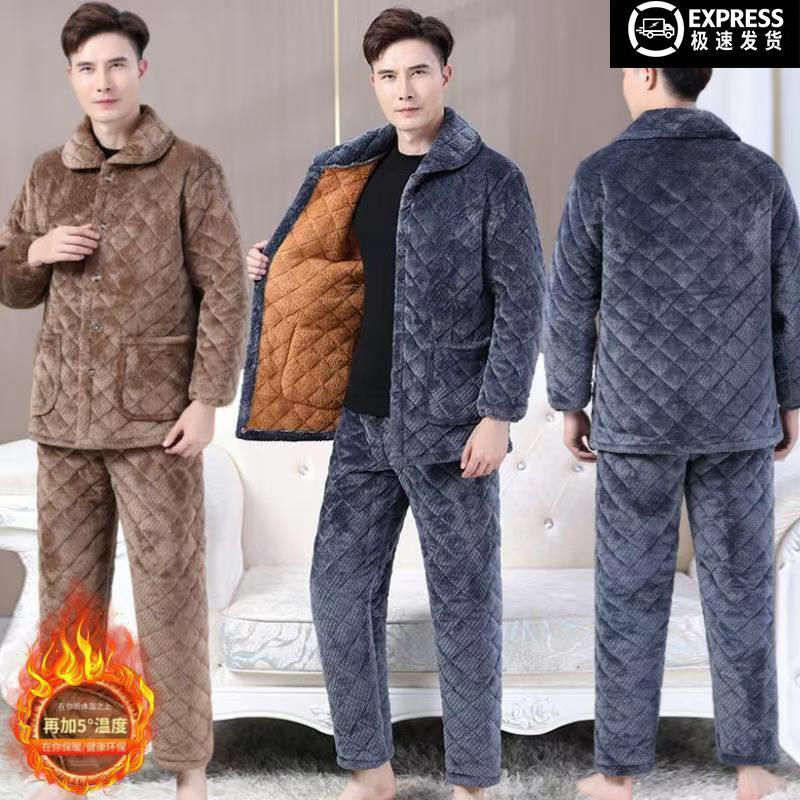 冬季睡衣男士家居服加绒加厚保暖套装珊瑚三层夹棉两件套棉衣棉裤