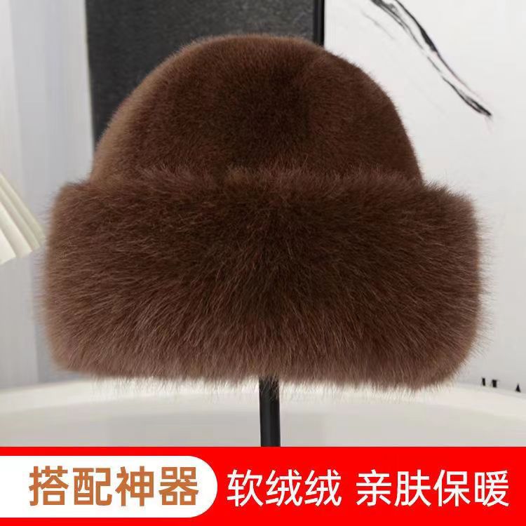 跨境新款户外蒙古帽貂绒仿水貂时尚轻奢毛绒帽保暖加厚高级感盆帽