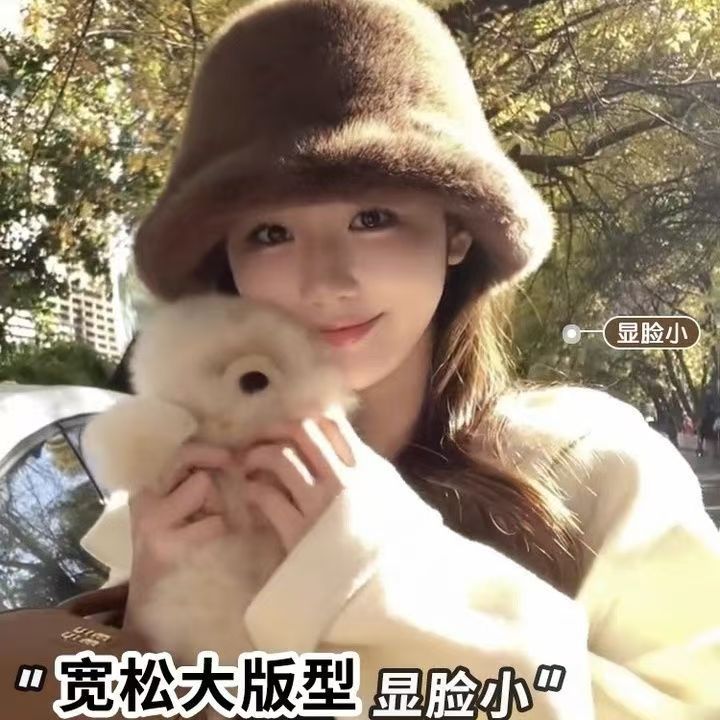 兔毛女毛毛秋冬款帽子百搭显脸小保暖渔夫帽大头围户外水桶帽盆帽