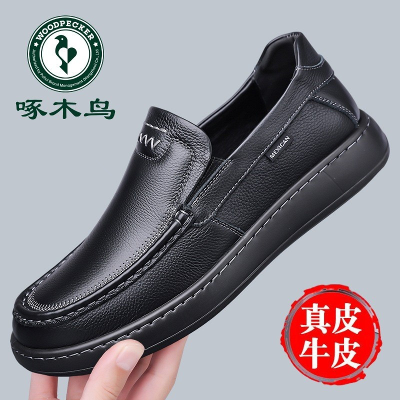 啄木鸟男鞋真皮休闲皮鞋男一脚蹬软底透气防滑黑色爸爸鞋气质男士