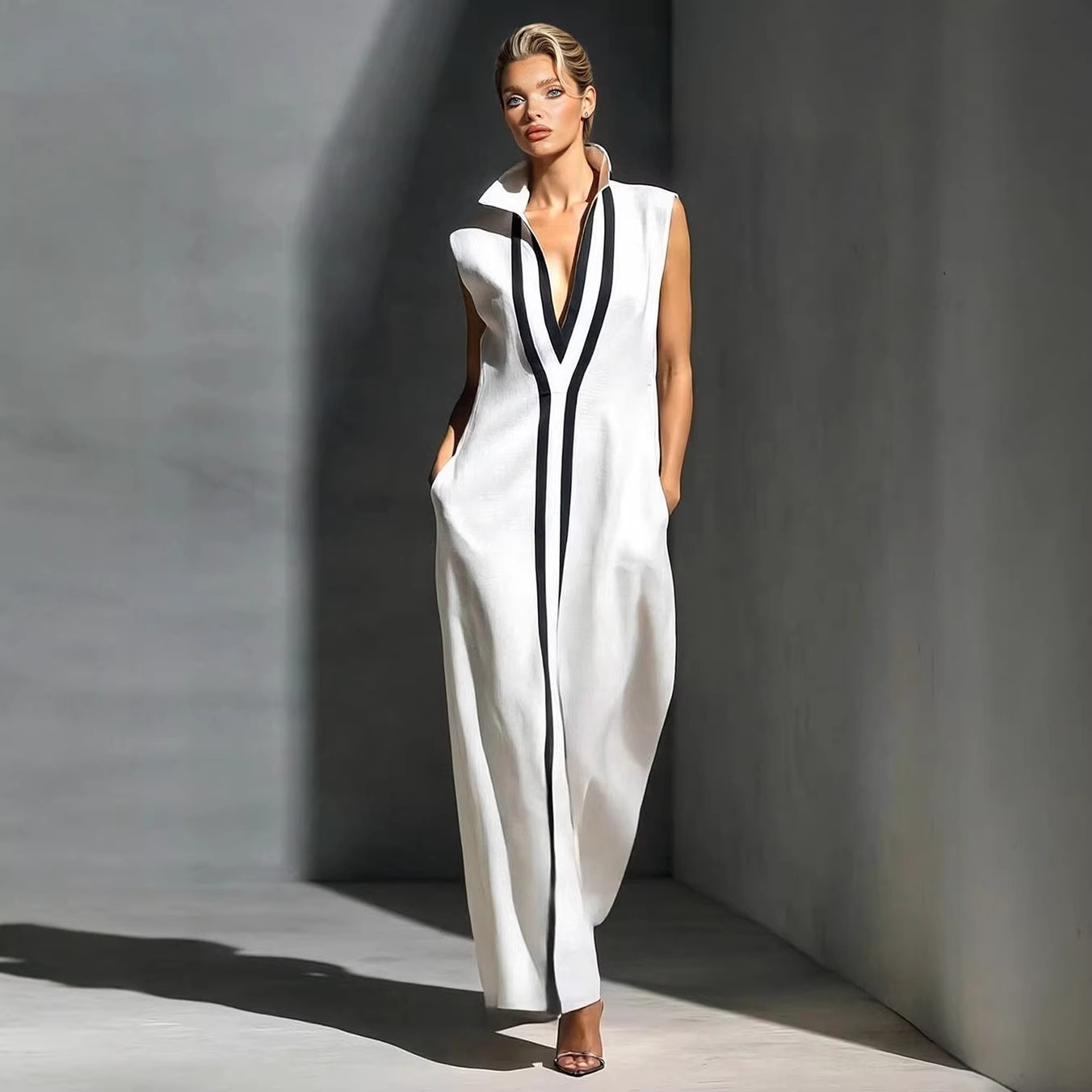 2026年夏季新款外贸女装时尚优雅无袖深V领撞色滚边长裙