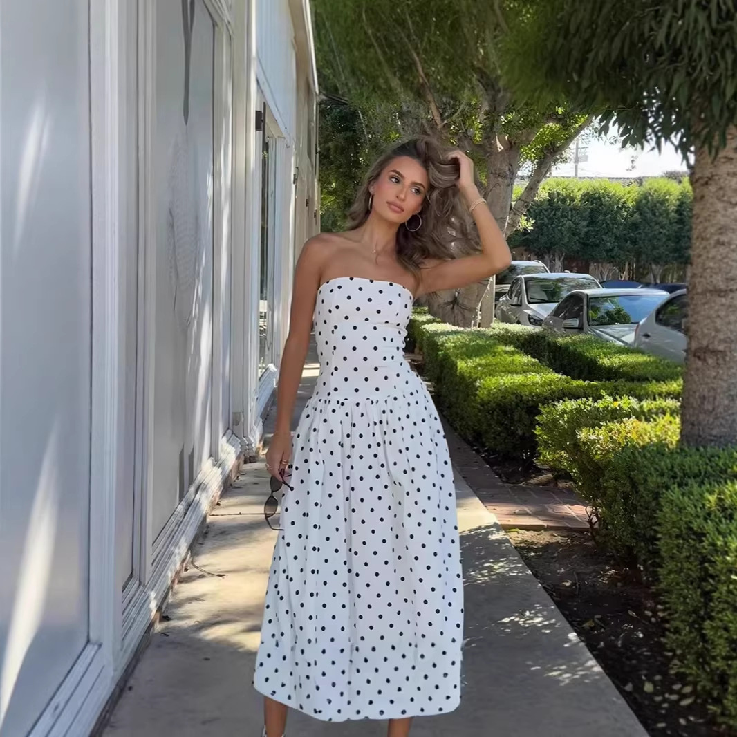2026夏季新款欧美跨境印花波点抹胸无袖休闲气质时尚收腰连衣裙