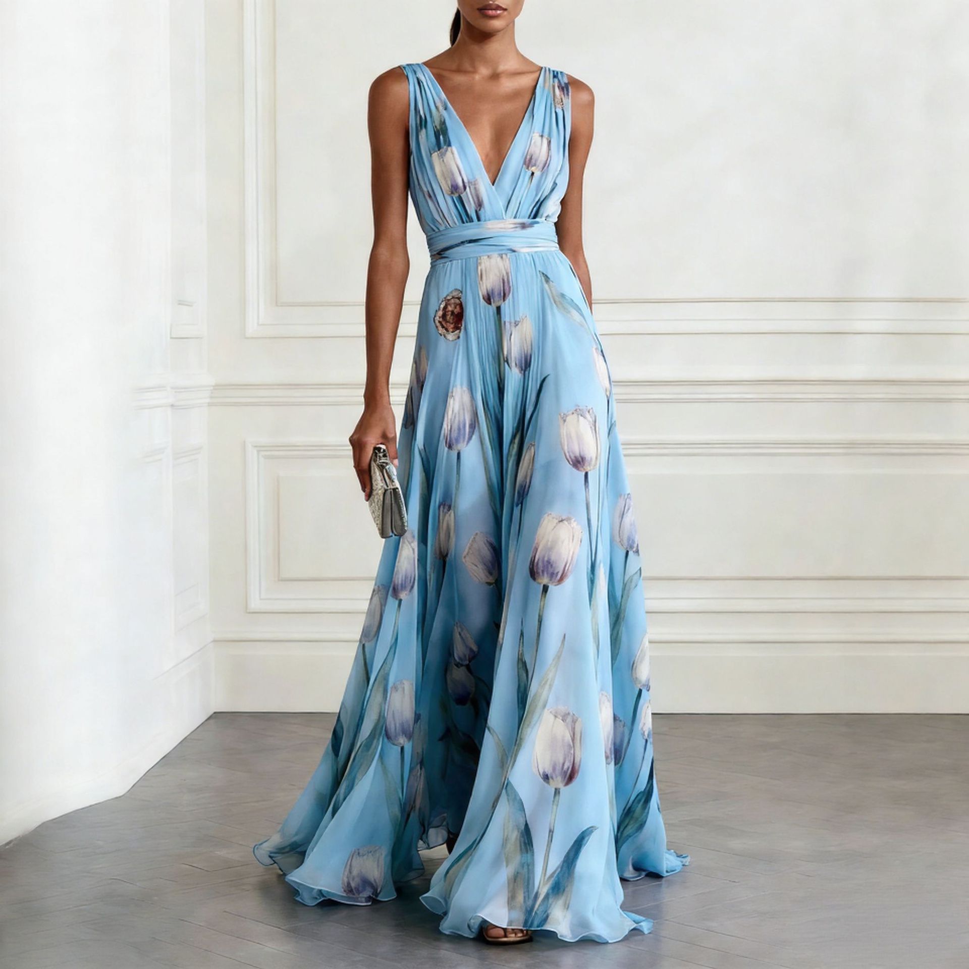 2026欧美跨境独立站新款郁金香印花晚礼服女装无袖V领长裙