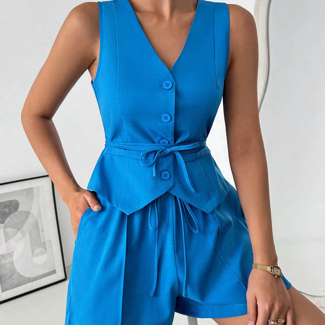 欧美女装搭配一整套无袖套装休闲收腰上衣初春多巴胺时尚短裤套装
