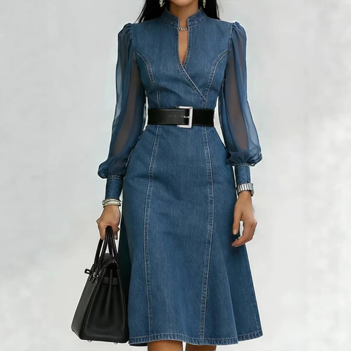 2026春夏新款欧美跨境长袖立领收腰显瘦长袖牛仔连衣裙