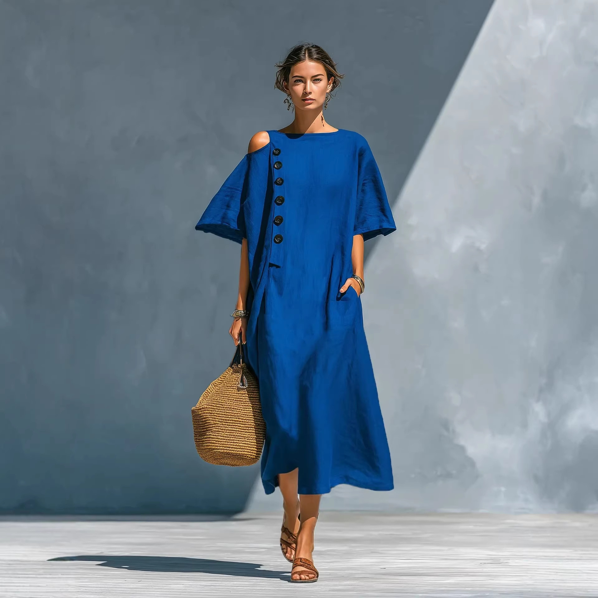 2026跨境欧美独立站夏季新款连衣裙女宽松显瘦中长款单肩纽扣裙子
