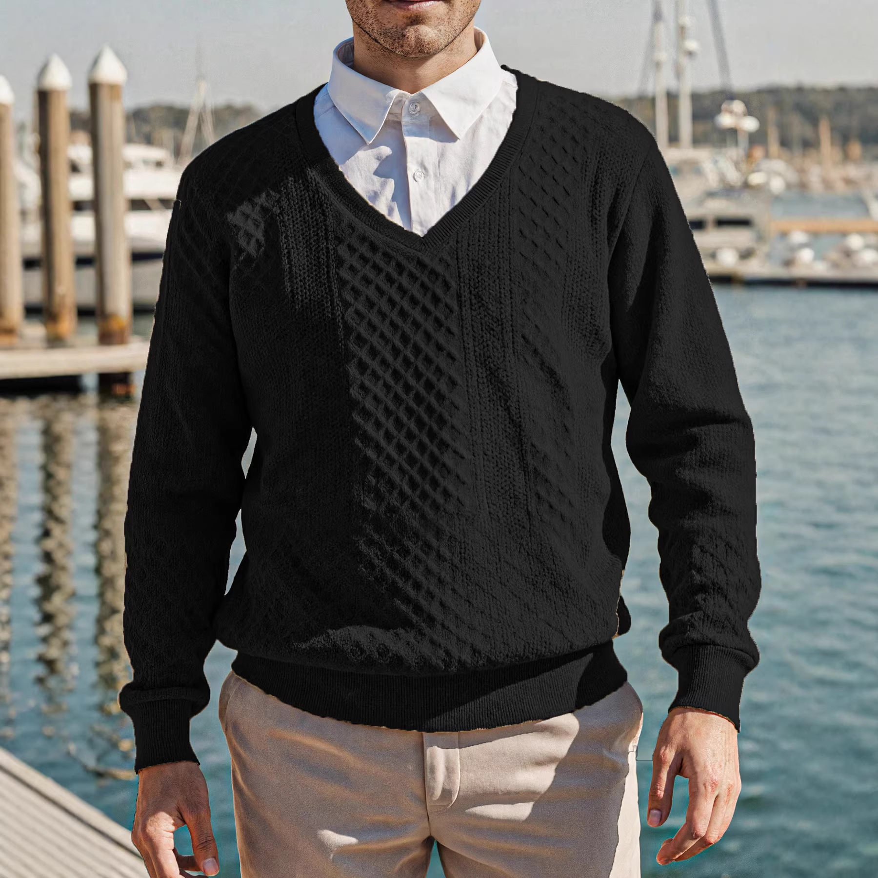 肌理感系带v领干净合身长袖T恤男春秋潮牌设计感痞帅针织条纹上衣
