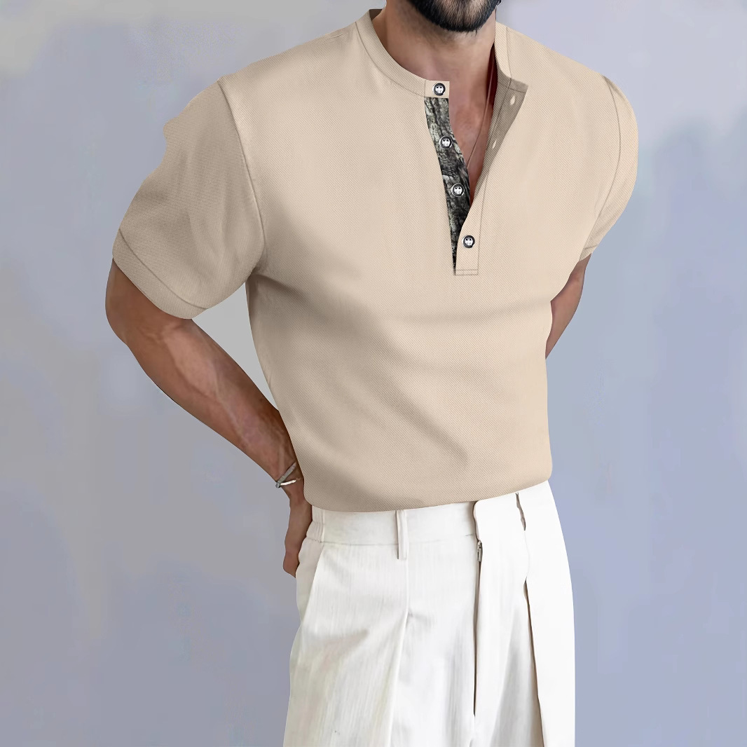 夏季新款男士亨利领套头短袖透气舒适棉混纺提花T恤韩版纯色男装
