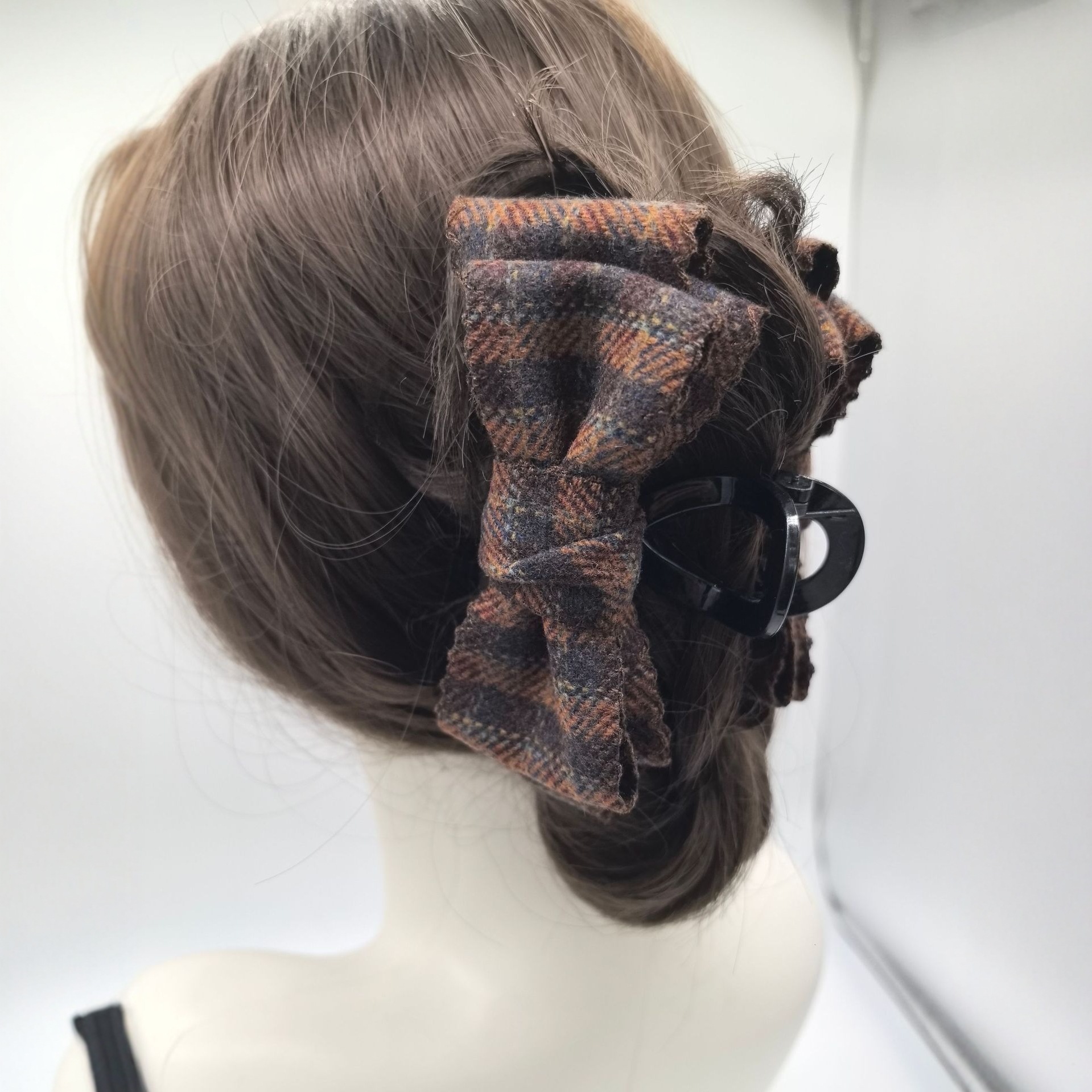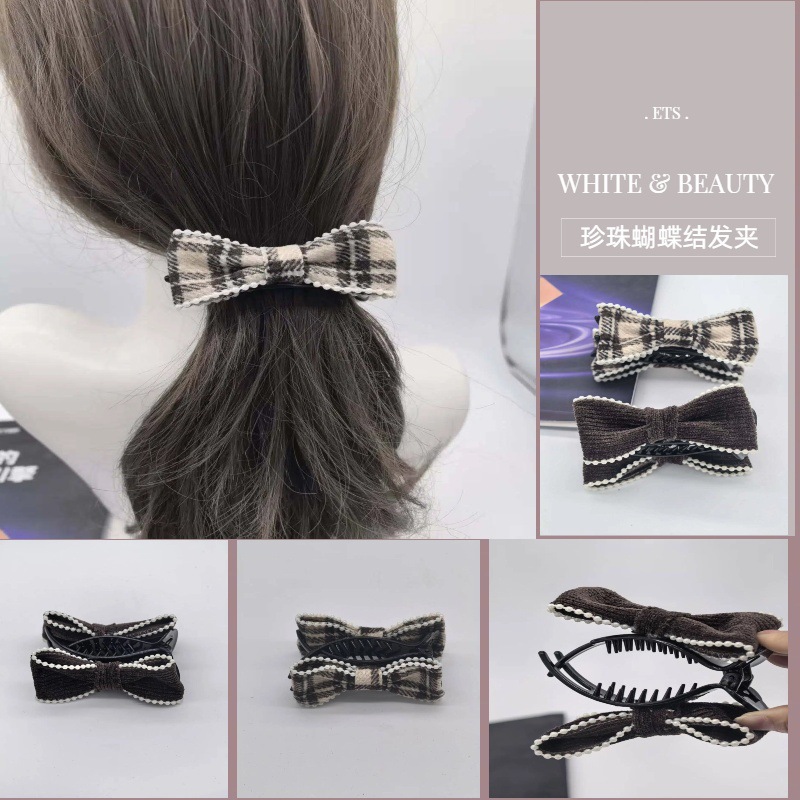 新款秋冬复古风毛呢格纹蝴蝶结抓夹英伦学院风大号发抓网红同款发